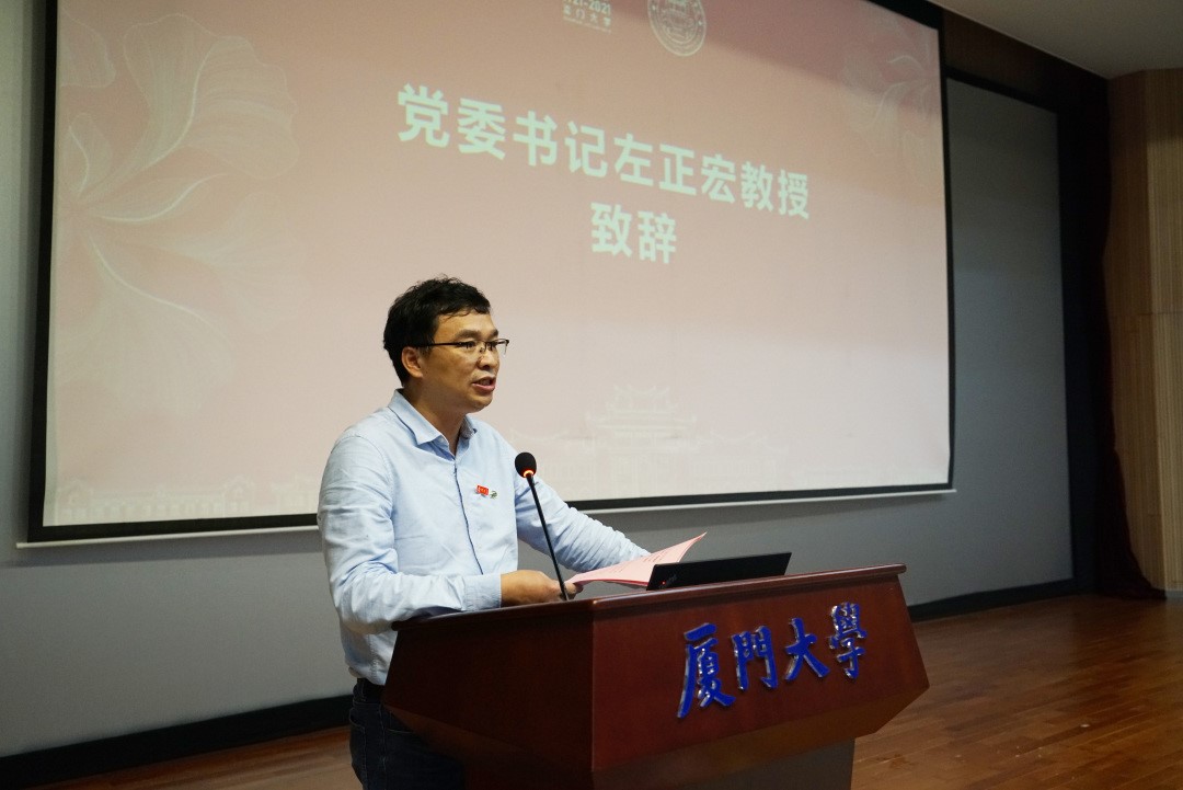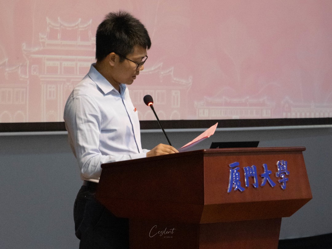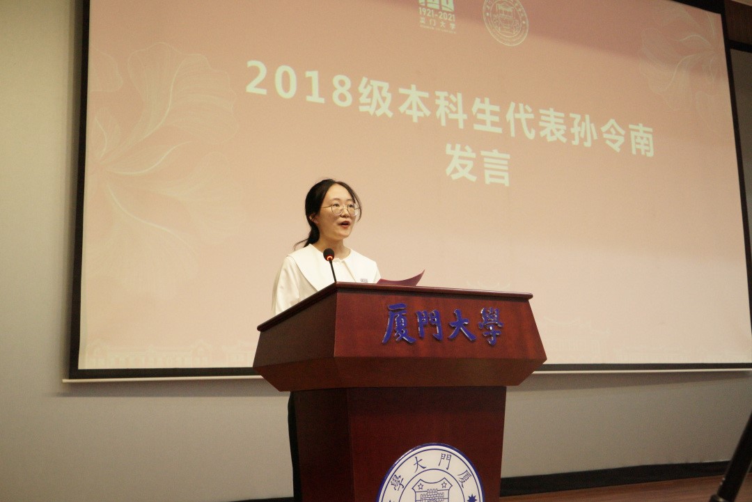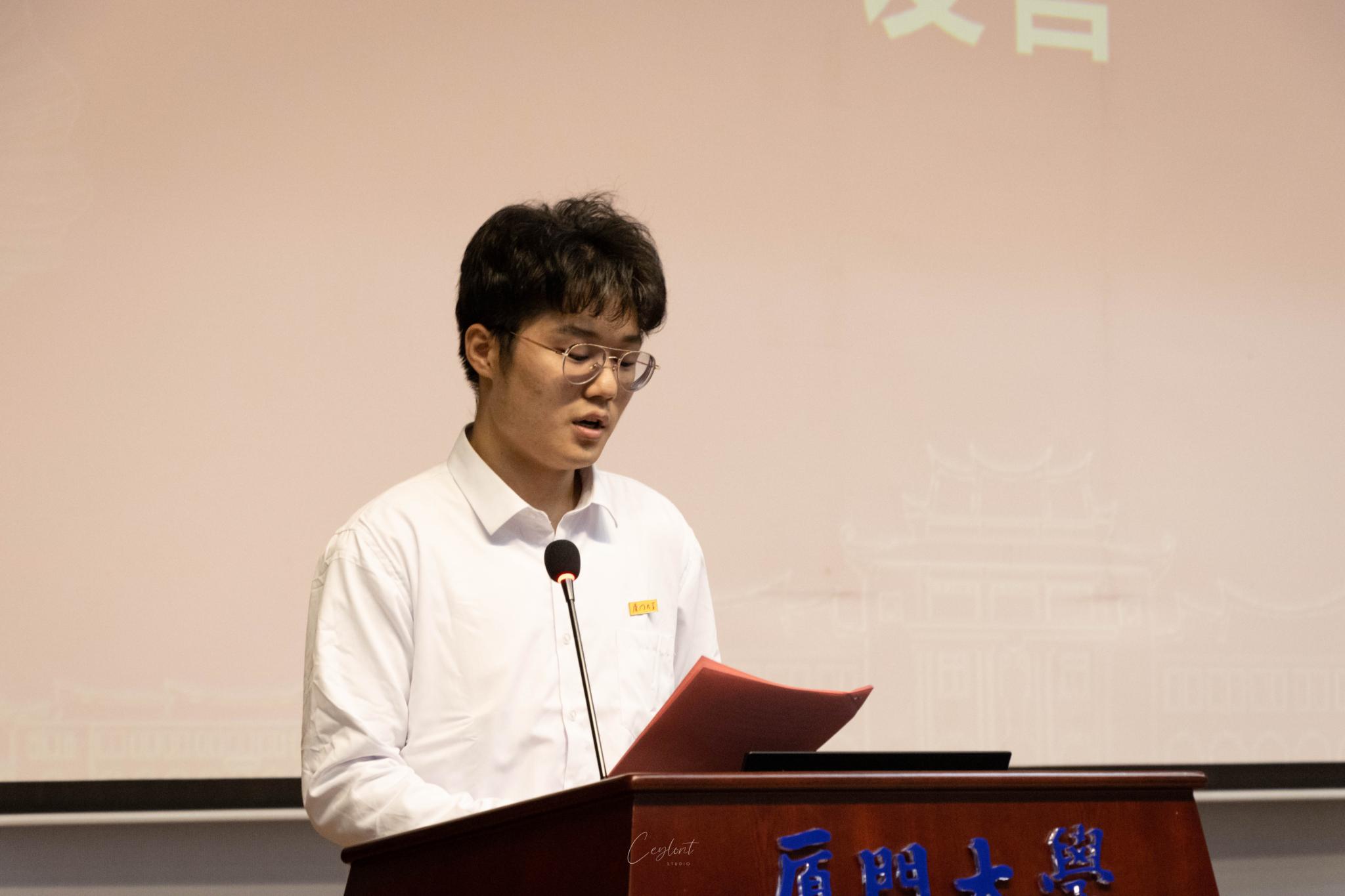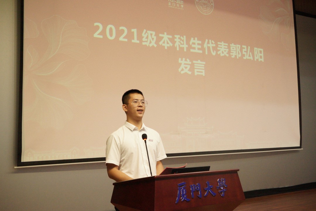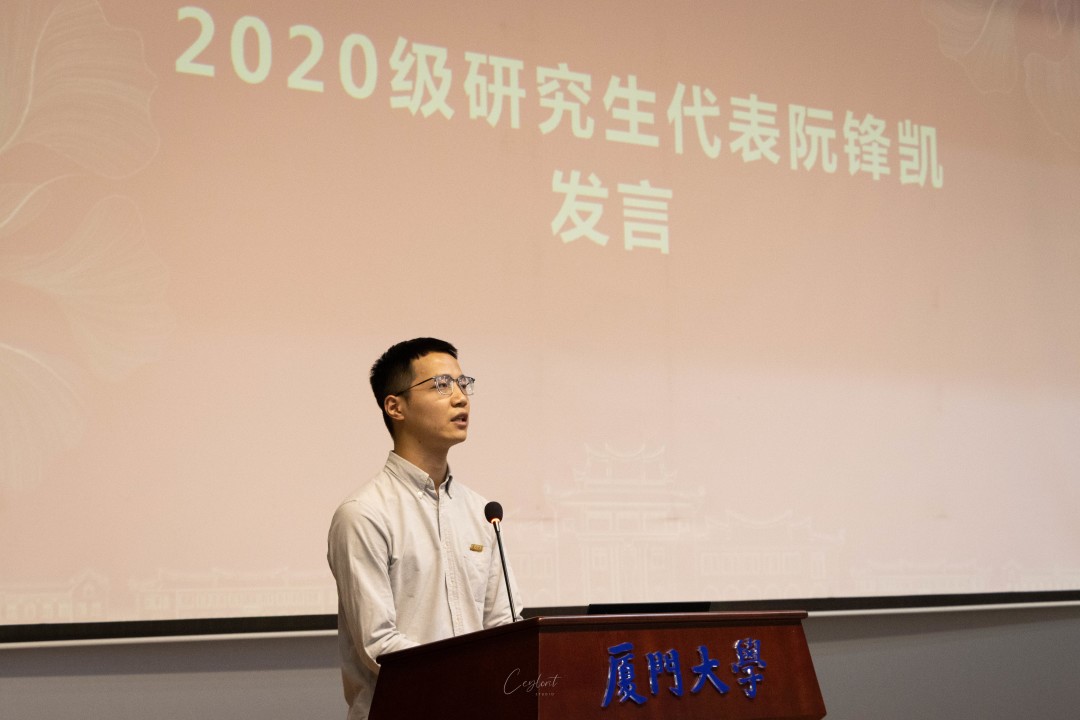 紧接着,郭弘阳、郑鹏同学分别代表本科生、研究生新生发言。郭弘阳同学真挚地表达了对参与疫情防控工作的志愿者们,以及为同学们的学习生活操心的老师们的感激与敬意,随后讲述了自己一家祖孙三代均为厦大学子的故事。他希望,全体本科新生能够实现自身理想和价值,敢于创新实践、善于发挥特长,为个人、社会以及国家的发展作出贡献。郑鹏同学则表示,研究生肩负着打破科技封锁、实现科技强国的历史使命,应当在科研事业上永葆热情、潜心研究,更应当涵养格局,将个人命运与国家、民族融为一体。