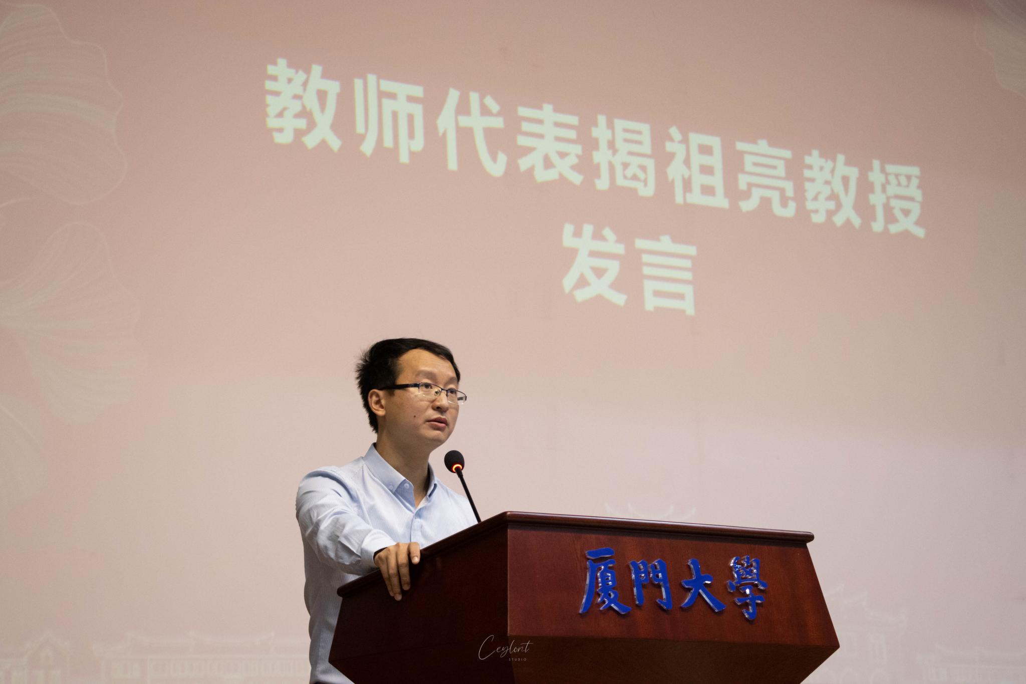 接下来,由教师代表揭祖亮教授发言。他提到,好的开端是成功的一半,每一阶段都要树立明确的目标,一步一个脚印前行,才能达到“会当凌绝顶,一览众山小”的境界。“成功的另一半是要坚持不懈。人生并非坦途,同学们会发现,学习生活是艰辛的。面对许多困难,同学们要拿出‘直挂云帆济沧海’的勇气和‘吹尽黄沙始到金’的信念,接受人生风雨的洗礼。”揭老师还提到,大学也是独立生活的开始,同学们应当学会自主规划学习生活;大学丰富多彩的实践活动、讲座、比赛等,不仅会让同学们获得专业知识,同时也会锻炼同学们合理安排时间以及人际交往的能力。他强调,要坚持锻炼身体,才能有饱满的精神状态迎接新的挑战。最后,揭老师祝愿同学们能够潜心向学、积极进取、扬帆起航,在毕业之际收获硕果累累的自己。