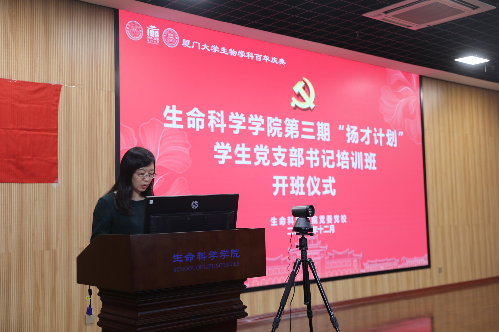 为深入学习贯彻宣传党的十九届六中全会精神,继续深入推进党史学习教育,进一步巩固全国党建标杆院系育人成效,推动我院学生党建工作质量再上新台阶,12月1日,生命科学学院第三期“扬才计划”学生党支部书记培训班开班仪式在黄朝阳楼五楼学术报告厅隆重举行。校党委党建办主任、组织部副部长、教师工作部副部长廖志丹,院党委书记左正宏,院党委副书记葛学凤、张宇斌等出席了本次开班仪式,参加仪式的还有学院党务秘书、组织员、辅导员、第三期“扬才班”全体学员和部分学生党员骨干代表。开班仪式由院党委副书记葛学凤主持。