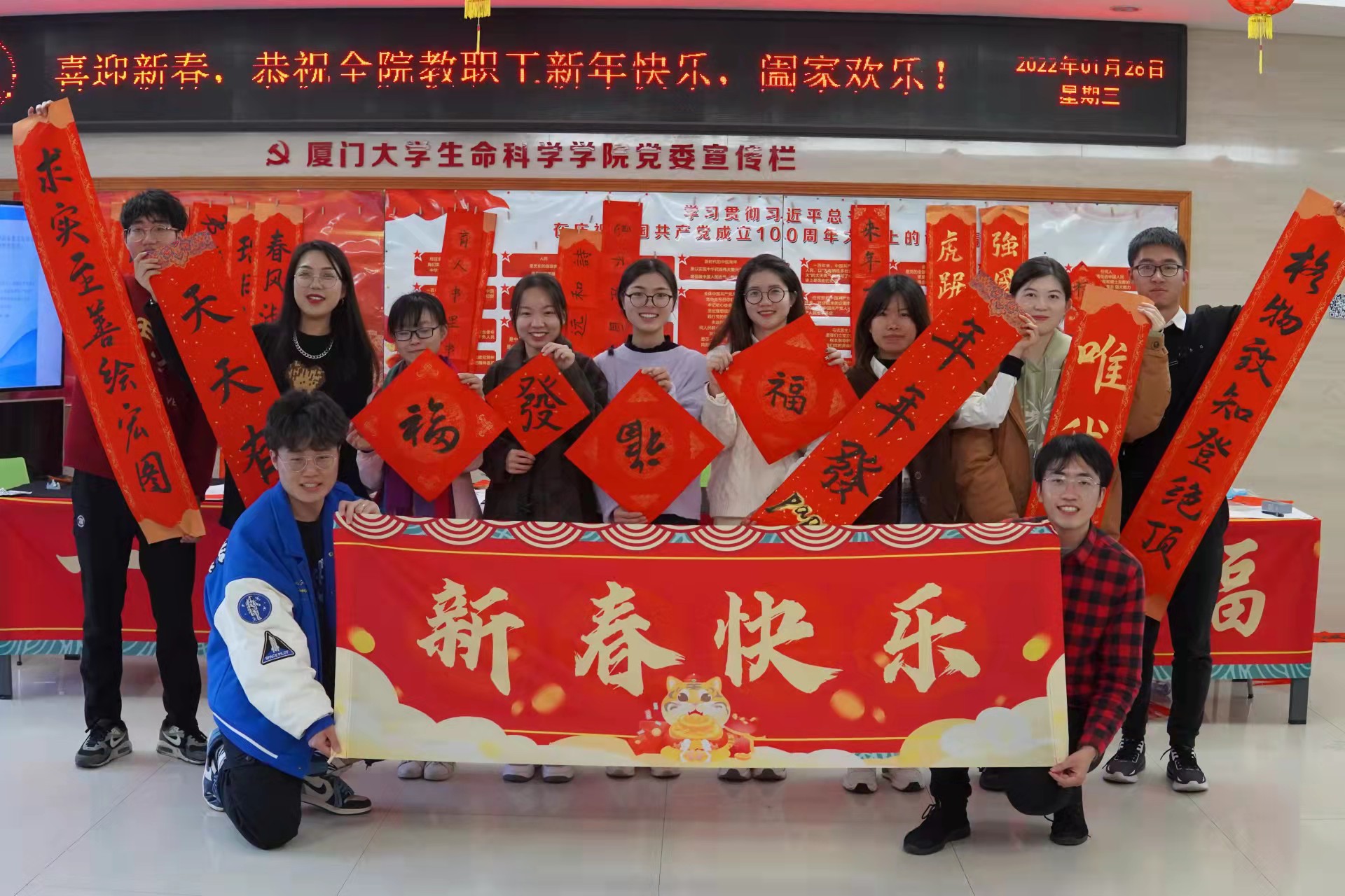 “科研事业节节高传承创新,服务保障样样好求实至善”、“生气虎虎迎百年,科研顺顺续华章”、“留厦迎春不见家,仁者爱人家在厦”……1月26日,在黄朝阳楼E栋大厅,书法爱好者们挥毫泼墨、笔走龙蛇,创作了充满喜庆、寓意丰富的对联,让大家感受到了浓浓的年味儿和中国传统文化的无穷魅力。活动现场还提供了自由创作平台,参与者可以将自己书写的祝福送给朋友和导师,传递新春接福纳祥的美好祝愿。此外,“百年梦 勇敢闯”趣味大闯关、“毽步如飞 跃动生科”踢毽子比赛、“观温情喜剧 过暖情新年”新春观影活动、“一绳一春 聚力生科”拔河比赛、“星星点灯 福照生科”灯谜会……形式多样、丰富多彩的系列文体活动,让留校学生的春节生活变得充实而美好。活动现场师生们热情洋溢、热闹非凡,大家一起在欢声笑语中迎来了虎年新年,同时以朝气蓬勃的面貌迎接生物学科百年庆典的到来。