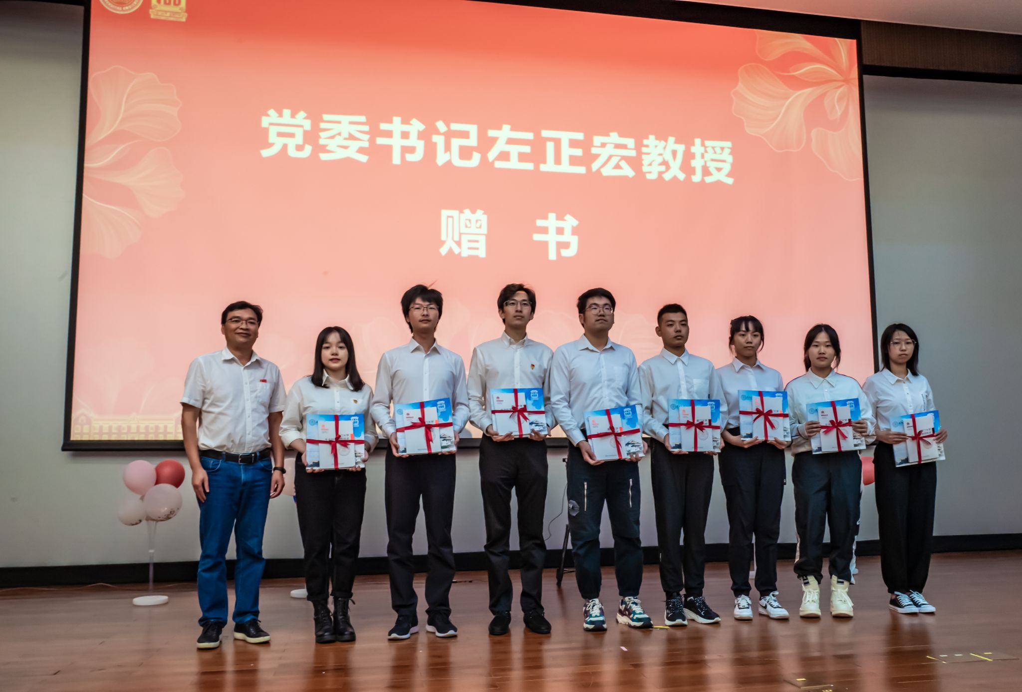 学院党委书记左正宏教授为新生代表赠书。学院今年将《厦门大学生命科学学院院史》一书和《传承创新,求实至善》百年画册赠与同学,希望同学们能更好地了解生物学科百年来的发展历程。