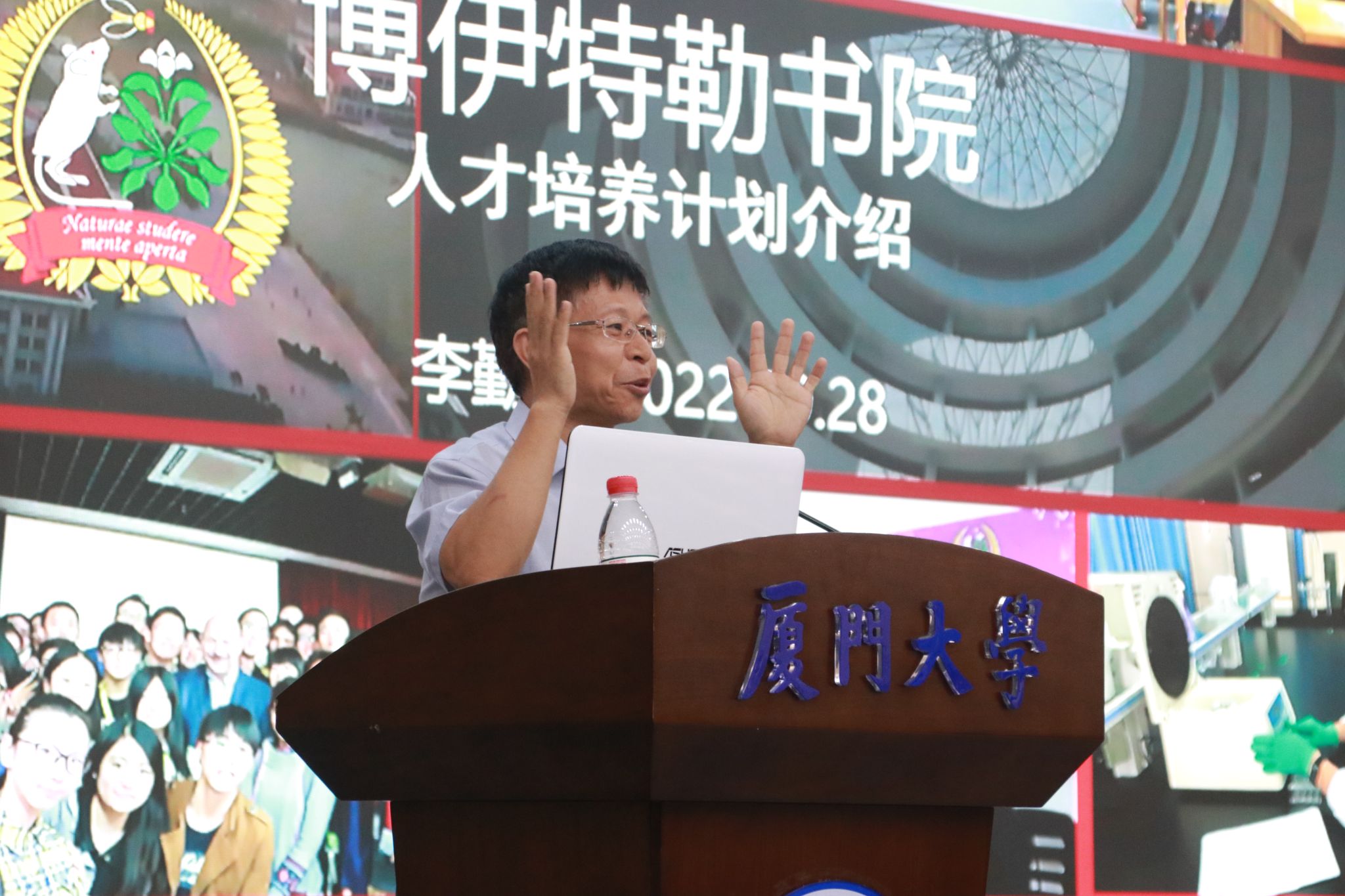 典礼开始,中国科学院院士、博伊特勒书院院长韩家淮教授致辞。首先,韩家淮教授对新生们的到来表示热烈欢迎。随后,他介绍了书院创办由来、办学目的和培养计划。韩家淮教授深情回忆了布鲁斯·博伊特勒先生“教育是传承文明和知识,培养青年一代的根本途径”的书院建设初衷,希望通过书院创新人才培养模式,营造包容多种教学方式的教学环境,提高生命医学领域本科生的教育教学水平。同时,他期望大家能做到三个珍惜:珍惜自己的机会,利用好学习资源全面提升;珍惜自己的时间,要对得起每一寸光阴;珍惜自己的一生,生活得深刻而有意义。最后,他勉励同学们与书院、与新百年厦大共同成长,成为视野开阔、人格健全、博学广闻又术业有专攻的人才。