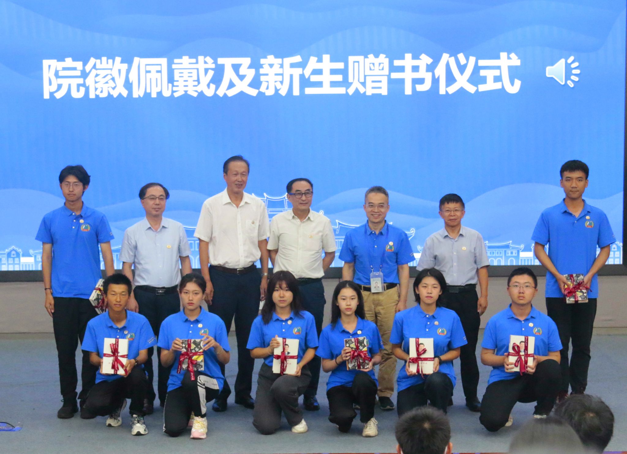 典礼最后,韩家淮教授为书院新生代表佩戴院徽,薛茂强教授、林忠宁教授、朱铉教授和李勤喜教授为新生代表赠书。