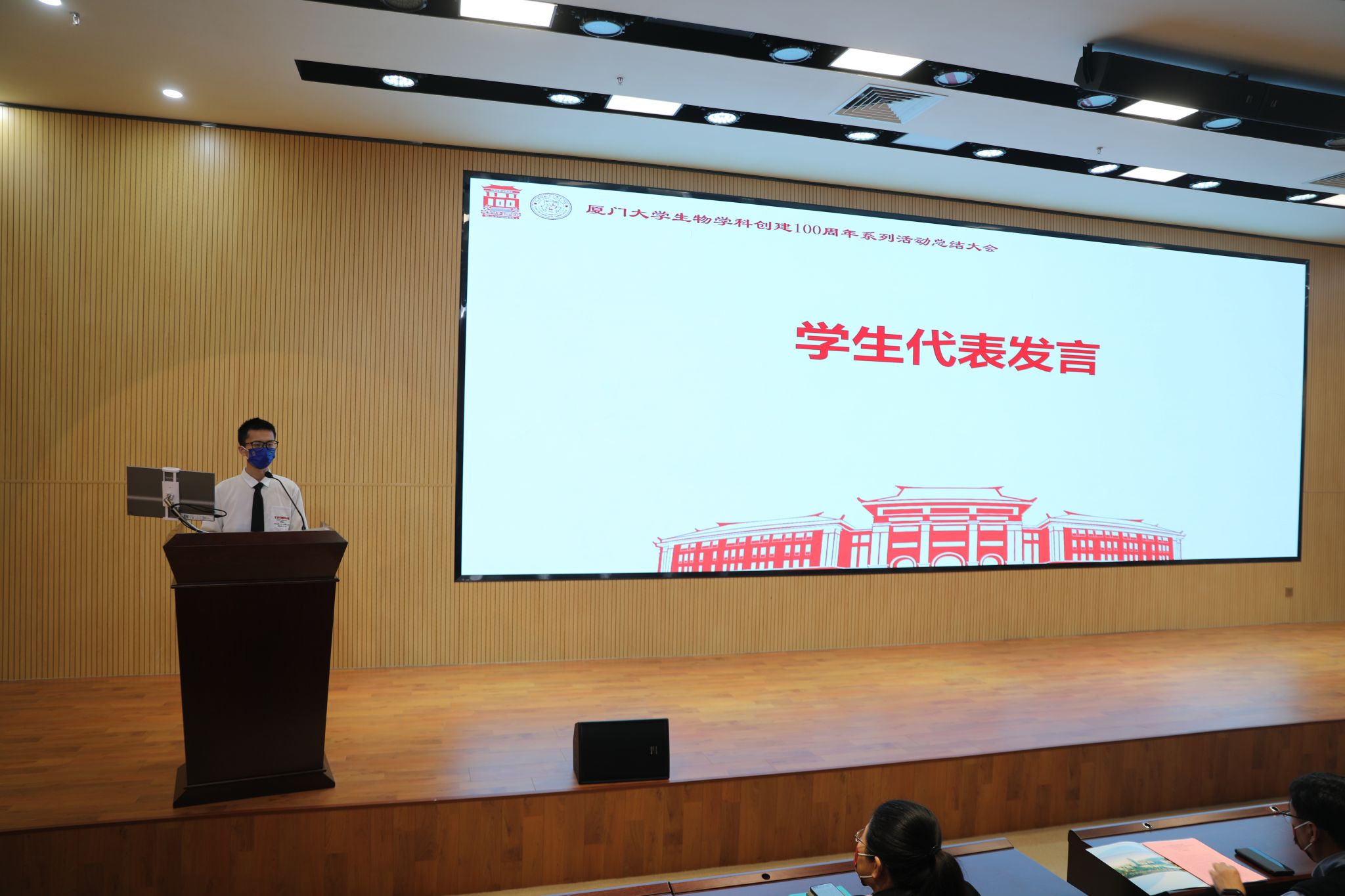 教师代表叶志云、志愿者代表姚雨膨先后发言,分享参与百年学科系列活动的经历与感受。他们表示,作为厦大生科人,能够见证生物学科创建百年的历史时刻并参与其中,感到无比骄傲与自豪,今后将继续弘扬“传承创新 求实至善”的生科精神,为学院新百年的建设发展贡献力量。