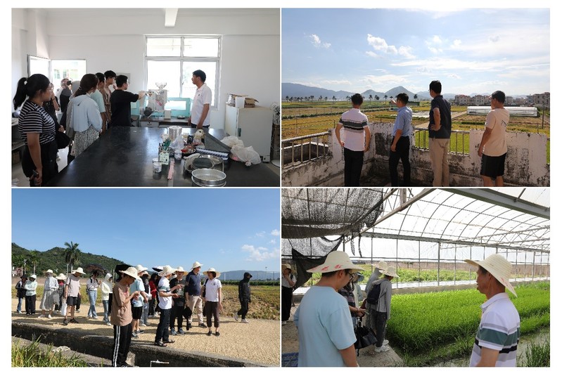 经过学习和讨论后,师生走出会议室,在生物学系党支部老师们的带领下,沿着“稻”路参观基地设施和实验田,了解一线水稻育种工作概况。基地始建于2006年,目前拥有60亩实验地和2200㎡的实验楼。实验地主要用于水稻种植,除了露天田地,也有网室以供室内育秧使用,实验田附近配有小型气象站便于环境观测。近年来学校对师生宿舍家具进行换新,对基地进行规范化管理,师生们的科研条件正在得到不断提升。