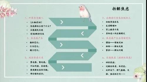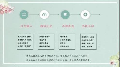 接着,老师从认识和拆解焦虑的角度让同学们更深层次了解焦虑。焦虑,是一种情绪感受,伴随着躯体性症状,同时还伴随着焦虑行为,是对未来不确定性感到恐慌。老师将焦虑拆解成了六部分,并且还指出焦虑并不一定都是有害的,适当的焦虑反而会产生恰到好处的动机,但是过度焦虑会导致异常,依然是有害的。