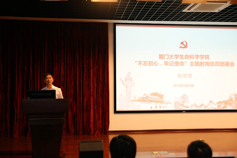 9月18日下午,生命科学学院“不忘初心、牢记使命”主题教育动员部署会在学院B栋5楼报告厅召开。学院党委书记张明智作动员讲话,部署学院主题教育相关工作。学校“不忘初心、牢记使命”主题教育第七巡回指导组组长洪永强教授出席会议并讲话。第七巡回指导组联络员、学院党政领导班子成员、全体教职工党员、支部委员和学生党员代表200余人参加会议。会议由学院党委副书记葛郝锐主持。