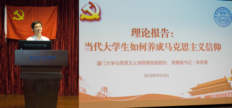 张有奎从习近平总书记提出的“新时代中国青年要树立对马克思主义的信仰”讲起,向同学们阐明了当代大学生养成马克思主义信仰的重要性,针对当代大学生养成马克思主义信仰的现状和问题,他以“苏联解体”为鉴,强调了“新自由主义”、“历史虚无主义”、“民主社会主义”和“民粹主义”等错误思潮是目前大学生养成马克思主义信仰的阻碍,马克思主义的科学性与革命性是坚定马克思主义信仰的关键所在。张有奎在报告中指出,“真学、真懂、真信、真用”是马克思主义信仰的养成之路,我们要牢记“思想一旦离开利益,就一定会使自己出丑”,学懂弄通马克思主义,解决现实生活中存在的实实在在的问题,奋力推进中国特色社会主义事业。