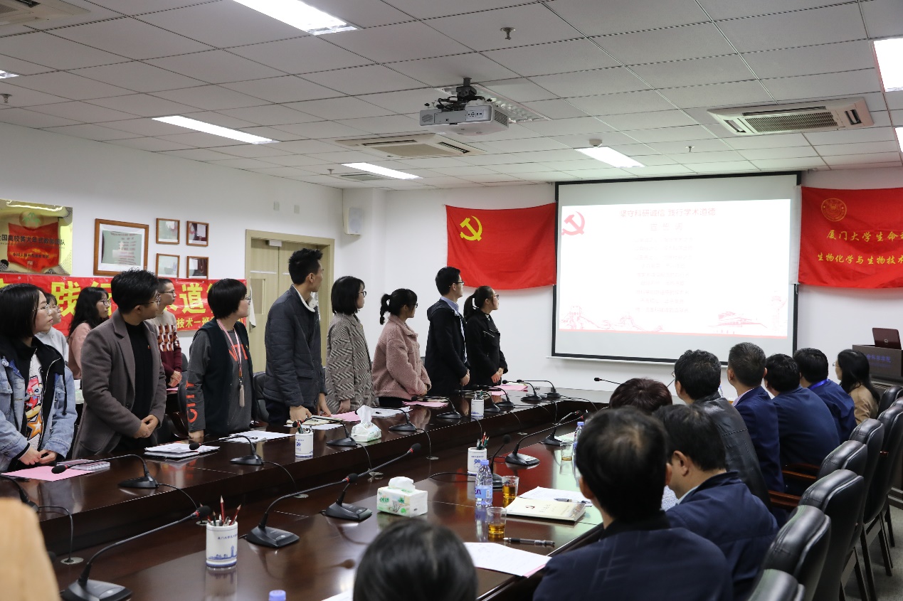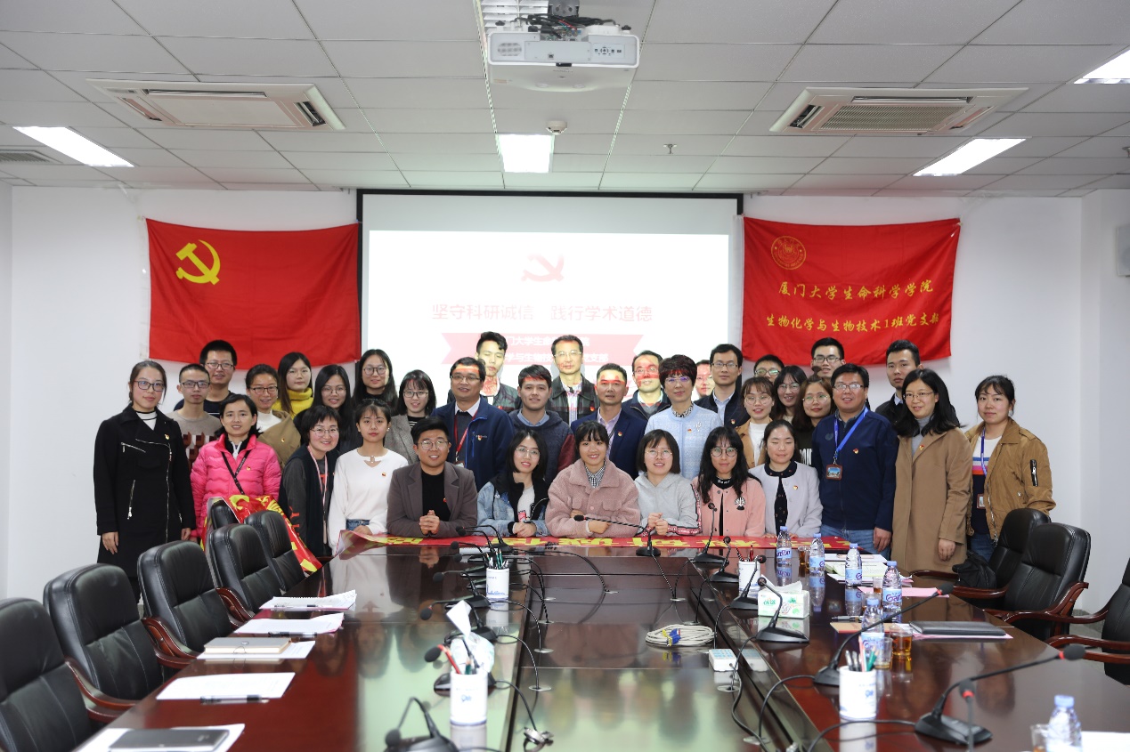 会上,支部成员一起学习了《厦门大学关于学术规范的相关工作规定和细则》,举行了“坚持科研诚信,践行学术道德”的庄严宣誓:“以至诚之心,恪守学术之德;以自强之心,探索科研之理;以至善之心,勇担社会之责……”。与会师生在倡议宣传横幅上郑重签下了自己的名字,表明“坚守科研诚信,践行学术道德”的坚定态度。