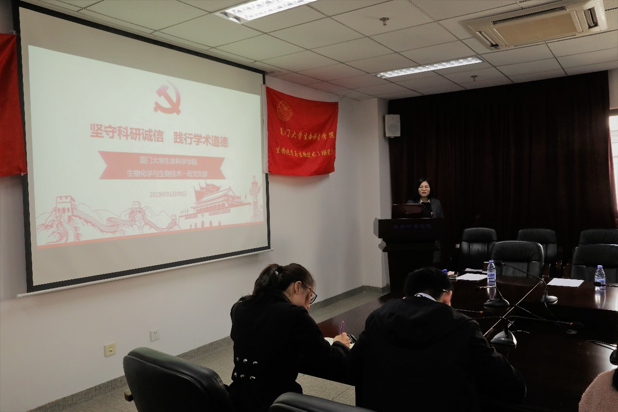 2019年1月9日下午,生命科学学院生物化学与生物技术一班党支部在黄朝阳楼B403会议室举行“坚守科研诚信,践行学术道德”为主题的“固定党日+”活动,校党委副书记、纪委书记赖虹凯作为联系该支部的校领导全程参与活动。学院党委书记张明智、副书记葛郝锐、葛学凤、副院长左正宏、共建支部—教育部高校“双带头人”教师党支部书记工作室、生物医学科学系教师党支部书记吴乔教授及部分党员代表也参加了此次活动,活动由支部书记王碧雪主持。