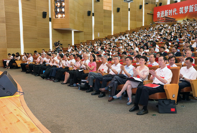 当天的会场洋溢着热烈、民主、团结、奋进的气氛。主席台后幕正中是镰刀和锤头组成的党徽,10面鲜艳的红旗分列两侧,会场后面伫立的展板上书写着“奋进新时代,筑梦新征程,为加快建设中国特色世界一流大学而不懈奋斗!”的大幅标语。