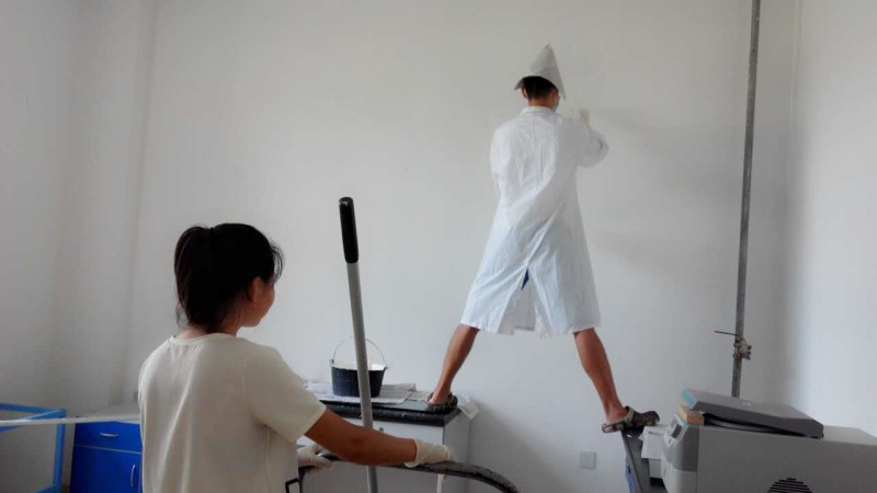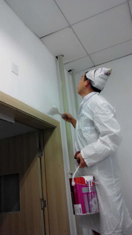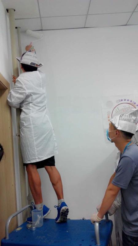 党支部预先组织同学首先调查摸清了霉菌存在之处,备齐了充足的除霉剂和防霉涂料。为不影响大家实验,支部同学选择晚上进行清霉工作,并通过QQ、微信、邮件等形式提前预告并通知了班级同学,让大家有充分的时间合理规划好实验计划。晚上八点,在支部同学的带领下,大家纷纷穿上白大褂、戴上口罩和自制的纸帽开始了清霉工作。大家合理分组,采取流水作业的形式,一部分同学在滋生霉菌的墙面上均匀喷洒除霉剂,另一组同学则用干净抹布擦除霉菌污渍。为了防止霉菌的再次生长,次日早上,同学们又早早地来到实验室,用防霉涂料将墙壁进行粉刷,彻底清除了墙上的污渍和霉渍。两天的工作中,大家不怕脏,不怕累,团结合作,劳动的同时也增加了交流、提升了配合、带来了快乐、分享了喜悦。