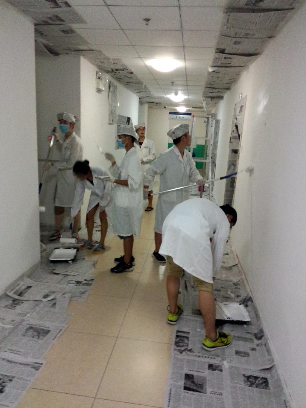 生物医学一班研究生党支部本着“谋事要实”的态度,动员实验室的党员和群众积极承担起清除楼道霉菌的重任。6月27日,在购买的除霉剂、消毒液、防霉涂料并收集大批废旧衣物和抹布后,党支部组织班级同学合理安排手上的工作,赶在晚上12点前完成当天实验计划。在晚上12点之后,“闲杂人等”一律撤离,以减少空气扰动,并封闭实验室门窗,防止楼道内的霉菌及其孢子飘落到实验室内部。准备就绪后,在楼道内滋生霉菌的墙面上均匀喷洒除霉剂,等待喷剂作用30分钟后,用干抹布将霉菌擦除,并立刻将抹布用消毒液浸泡处理。为了防止霉菌的孢子四处飘散,负责除霉的同学也迅速撤离,使得空气中的孢子有一夜的时间可以尽量沉降到地面上。第二天早上8点整,另一批支部成员使用消毒液浸泡过的拖布,将走廊地面和墙壁彻底清洁一遍,以杀灭沉降在地面上的孢子。之后打开实验室门窗,将实验室内部用另一批消毒液处理过的拖布进行彻底清洁。最后,为了防止霉菌的复发,支部成员用购置的防霉涂料对墙面进行重新粉刷,在认真干活的同时,也让大家体验了一把“粉刷匠”的乐趣。