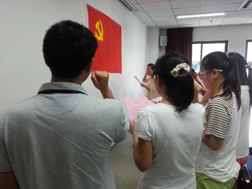 座谈会结束后,举行了新党员入党宣誓仪式。在学院团委书记毛毛的领誓下,新党员面对鲜艳、神圣的党旗,举起右拳,在党旗面前许下了铮铮誓言,在场的党员也一起重温了入党誓词。