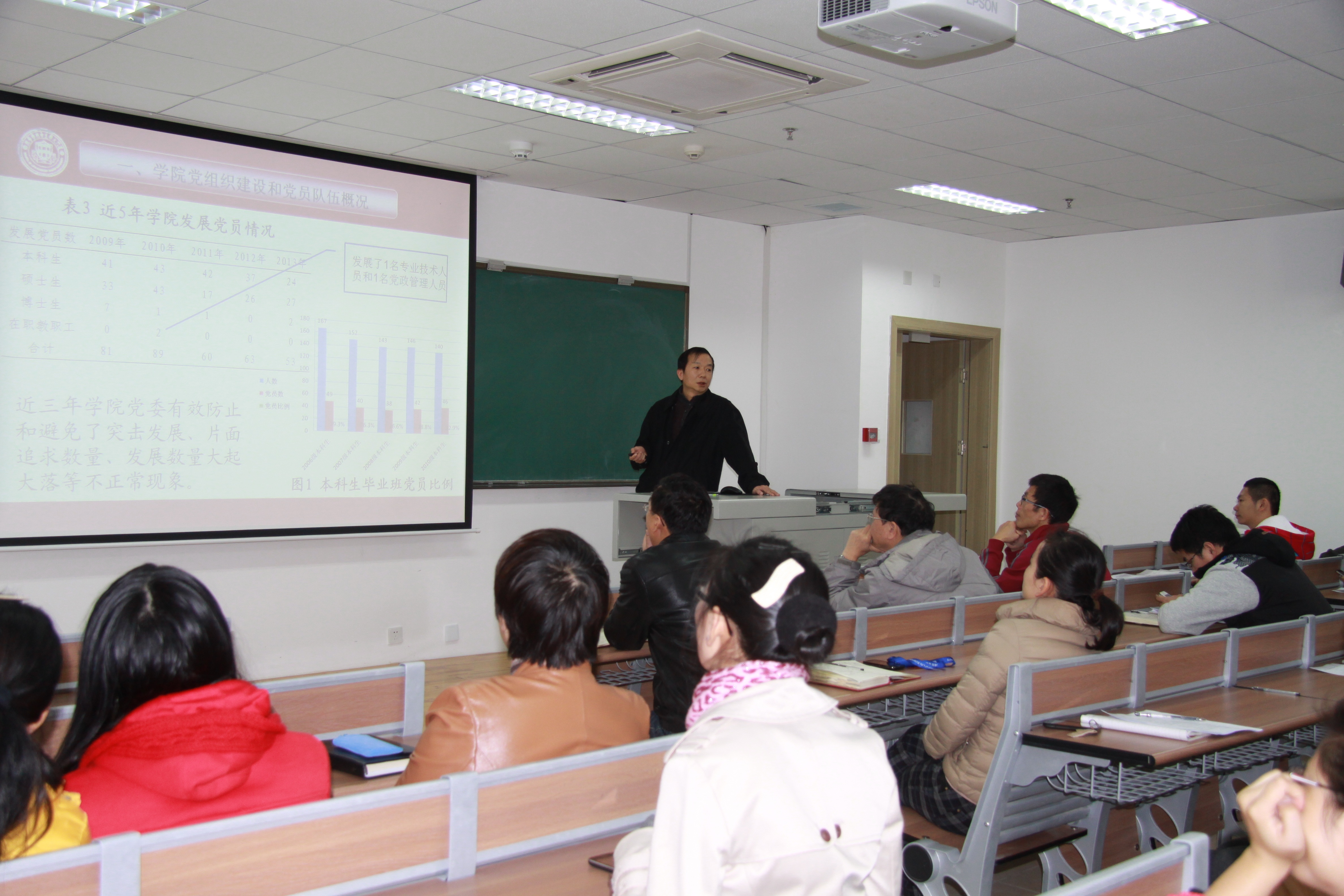会上,学院党委书记陈光首先作题为《加强学院基层党组织建设,提升服务能力,为学院科学发展提供坚强政治保证》的讲话。他的讲话借助PPT,用5年来的详实数据和图表介绍了学院党组织建设和党员队伍的概况,总结了学院党委贯彻落实《条例》的主要作法及成效,也指出了学院基层党组织建设存在的一些问题,并就如何提高学院基层党建科学化水平提出了有针对性的创新举措。