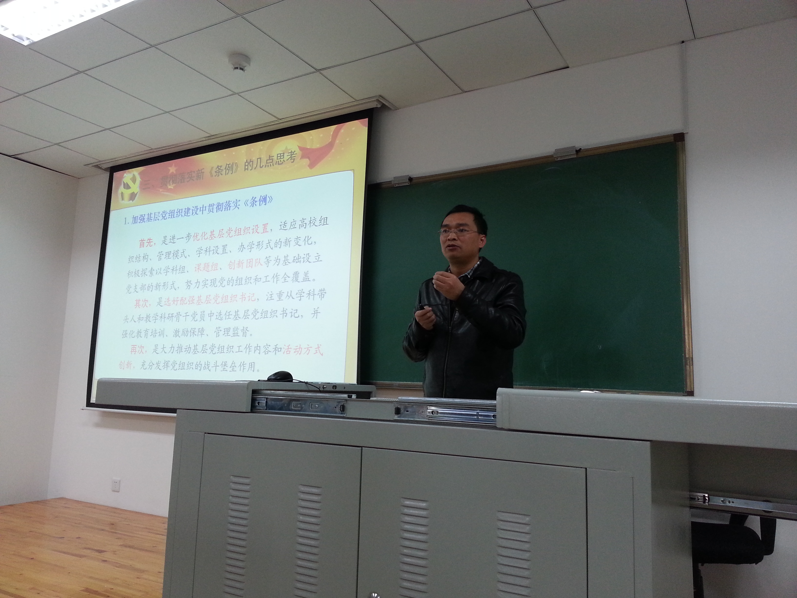 学院党委副书记左正宏为支部书记和组织委员作培训,与大家分享了自己学习《条例》的体会。他介绍了新《条例》出台的背景和特点,将新旧《条例》进行对照,指出了修订后新《条例》的几大变化,并就如何更好地贯彻落实新《条例》,作出了在基层党组织建设中优化基层党组织设置、选好配强基层党组织书记、推动基层党组织活动方式创新;加强党员队伍建设,健全党员教育、管理、服务和发展的长效机制,做好服务关爱党员工作;学习宣传贯彻《条例》,将《条例》学习纳入党校培训教材,做好宣传引导等方面的思考。