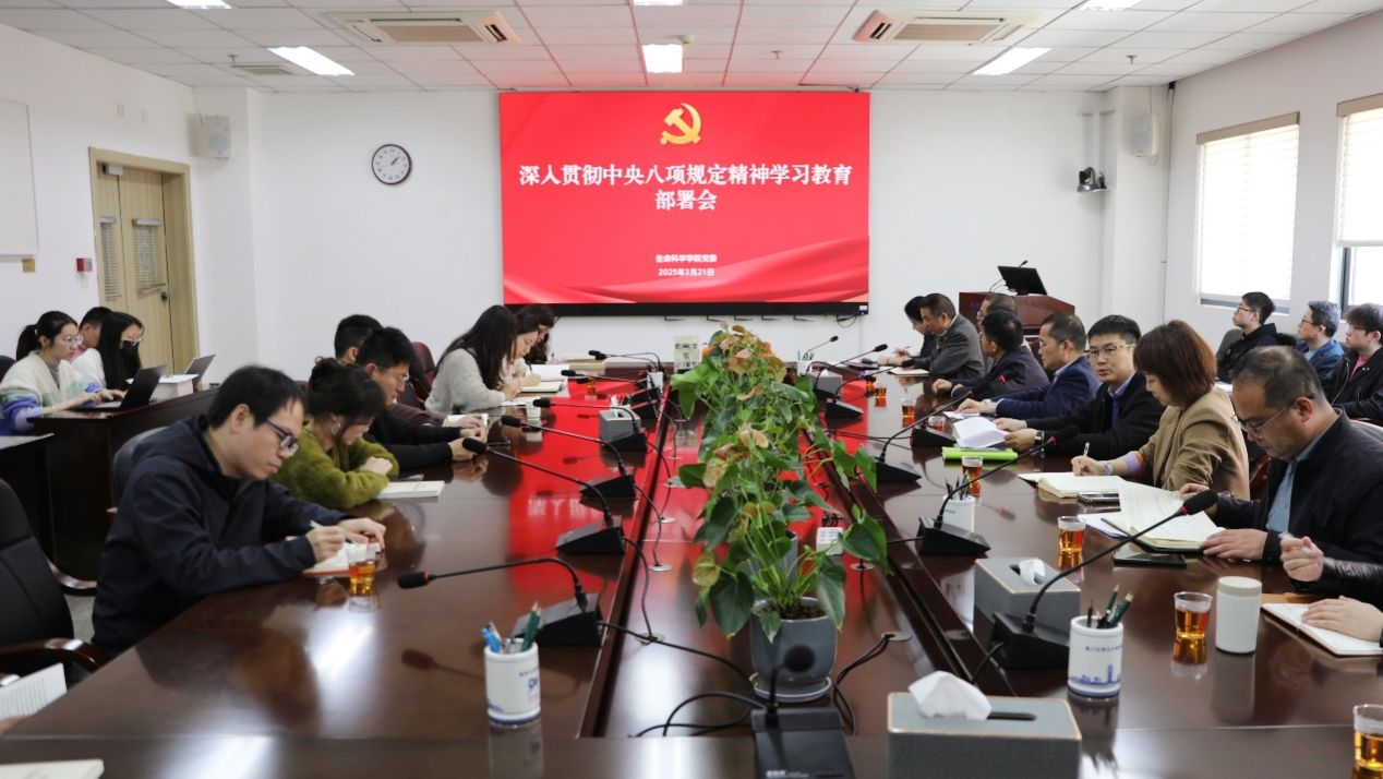 3月21日中午,生命科学学院党委在黄朝阳楼B403会议室召开深入贯彻中央八项规定精神学习教育部署会,传达学习中央党的建设工作领导小组会议精神和中共中央办公厅印发的《关于在全党开展深入贯彻中央八项规定精神学习教育的通知》文件精神,按照校党委部署安排,正式启动深入贯彻中央八项规定精神学习教育有关工作。学院党委书记马进龙主持会议并作工作部署。
