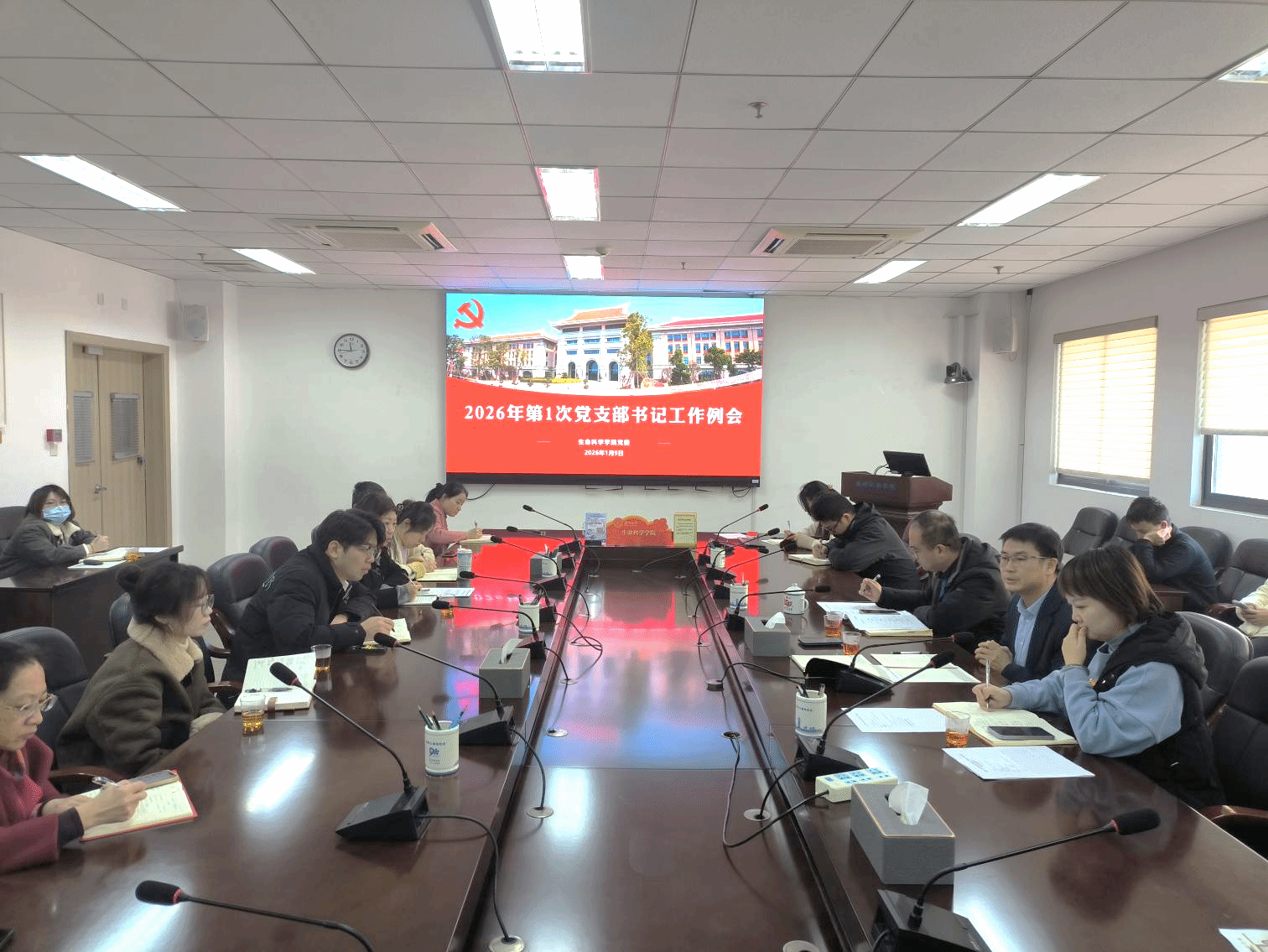 1月9日中午,生命科学学院党委在黄朝阳楼B403会议室召开2026年第1次党支部书记工作例会。学院党委书记马进龙,副书记乐无恙、徐莹,党务秘书、组织员及各师生党支部书记、支委参加会议。会议由徐莹主持。