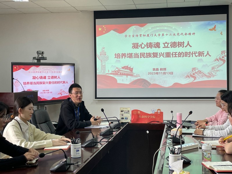 为扎实推进学习贯彻习近平新时代中国特色社会主义思想主题教育,深入贯彻落实厦门大学第十二次党代会精神,2023年11月13日,动物学一班党支部于黄朝阳楼B308开展主题党日活动。特邀学校第十二次党代会参会代表袁晶教授出席本次活动。