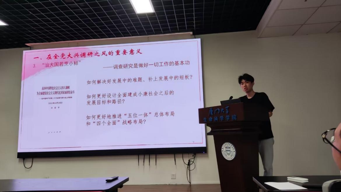 5月15日下午,生命科学学院本科生第二党支部在黄朝阳楼E307组织开展“铸就社会主义文化新辉煌,练好调查研究基本功”固定党日+活动。支部党员、入党积极分子、入党申请人均参加本次活动,21级入党积极分子林智宏、姚雨膨、王一博主持本次活动。