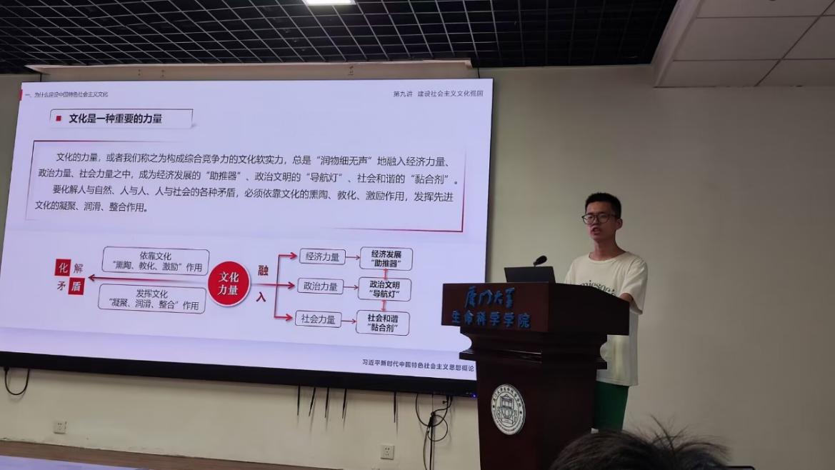姚雨膨以《中共中央关于党的百年奋斗重大成就和历史经验的决议》中对于文化自信的论述为切入点,分别从“为什么建设中国特色社会主义文化”和“为什么要坚持马克思主义在意识形态领域指导地位的根本制度”两个方面分别对建设社会主义文化强国、巩固马克思主义在意识形态领域的指导地位的必要性进行阐述,让同学们深刻体会到文化繁荣兴盛对中华民族伟大复兴的重要性,以及应当如何进一步增强文化自信、增强意识形态领域主导权和话语权。