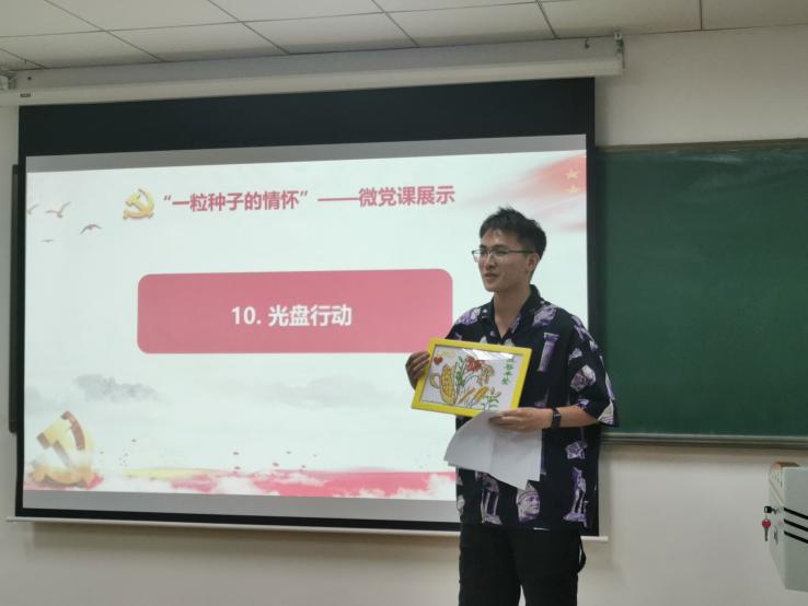 来自生医七班党支部的第5支队伍由博士后陈旗涛同志讲述微党课。他分享到:“我来自农村,对农村生活再熟悉不过了。农村的打谷、插秧都是必修课,好收成是农民们的生计来源。一衣一饭,当属来之不易。节约粮食,久久为功。” 陈旗涛同志的讲述引起大家的共鸣,大家纷纷响应要在以后的生活中落实“光盘行动”,真正地做到“粒粒皆辛苦”。