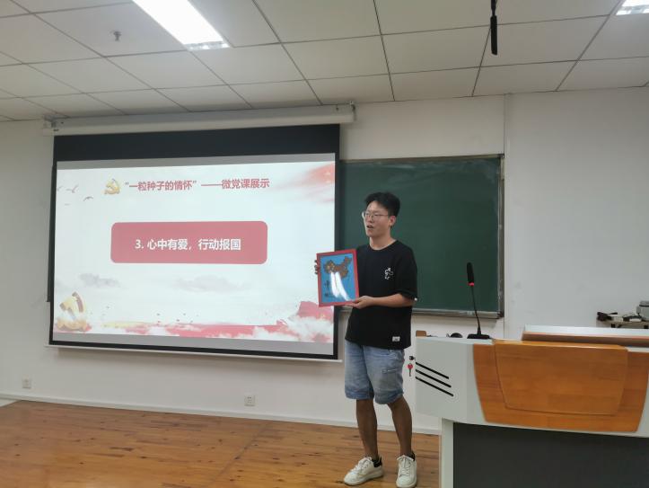 植物学二班党支部的王玉莹所在队伍来自水稻育种组,他们对国家育种及粮食安全工作颇有体会。队伍成员首先展示了共同制作的“五谷丰登”种艺画,随后通过袁隆平院士“稻田乘凉梦”、生科院王侯聪教授的“生科佳禾”实例及自己课题组的水稻育种工作三方面讲述了“不负‘粮’心”的微党课,号召支部党员们继承老一辈的科研信念,树立粮食安全观,为保障中国的粮食安全贡献力量。该支队伍的讲述获得大家的一致好评,摘获本次微党课大赛一等奖。