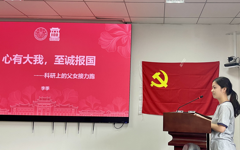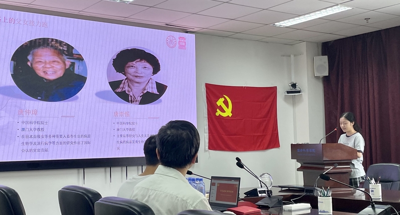 为做好党员教育管理,活动首先由毕业生党员李季讲党课,她以学院唐仲璋、唐崇惕父女在科学研究、教学育人等方面的贡献,勉励支部成员要大力弘扬科学家精神,结合专业特色,在青春的赛道上奋力奔跑。