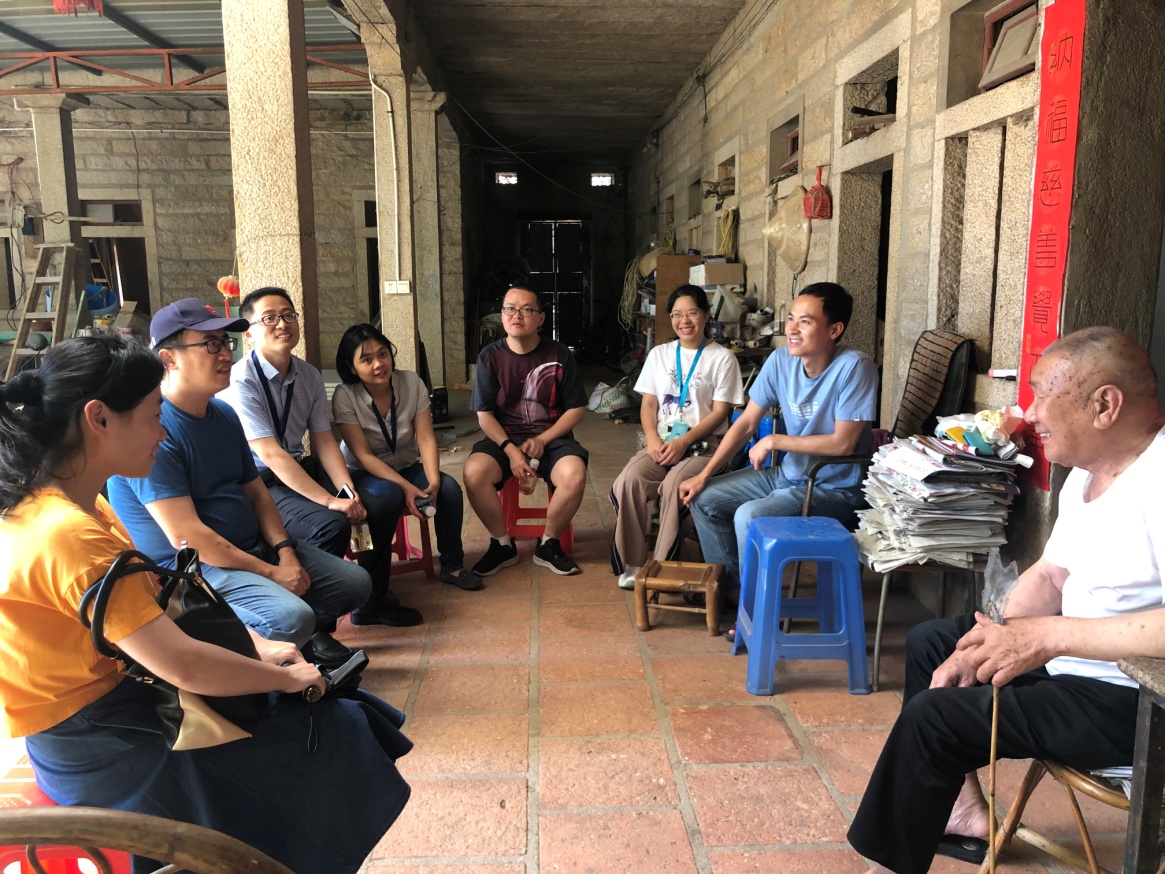 从学院到大宅村仅十分钟的车程,支部书记黄慧英带着大家走到一个两层楼的石建筑院落,房子外观满是岁月的沧桑,在周围一栋栋新楼房环绕下很显特别。走进院子,两位慈眉善目的老夫妇停下手中的事情,热情地迎上来。“陈老师,今天我们支部的党员们来听您介绍老一辈的故事!”支部书记握着老人家的手,说明来意。