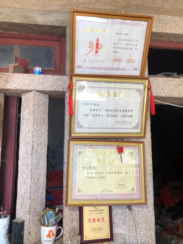 老人家非常低调,他是一名老党员,也是一名从教三十余年的乡村教师即便退休二十几年了,还一直在践行一名党员的初心,四处帮助需要的人,还参加村里党建工作。从墙上的奖状上,支部成员们了解到老人家先后被评为:“全国老有所为先进典型人物”、2016年度厦门“十大平民英雄”、2015-2016年度厦门市“道德模范”等称号。大家深受老人家的鼓舞,看到了一位看似平凡普通的老党员,如何用一辈子在践行着一名党员的庄严承诺。