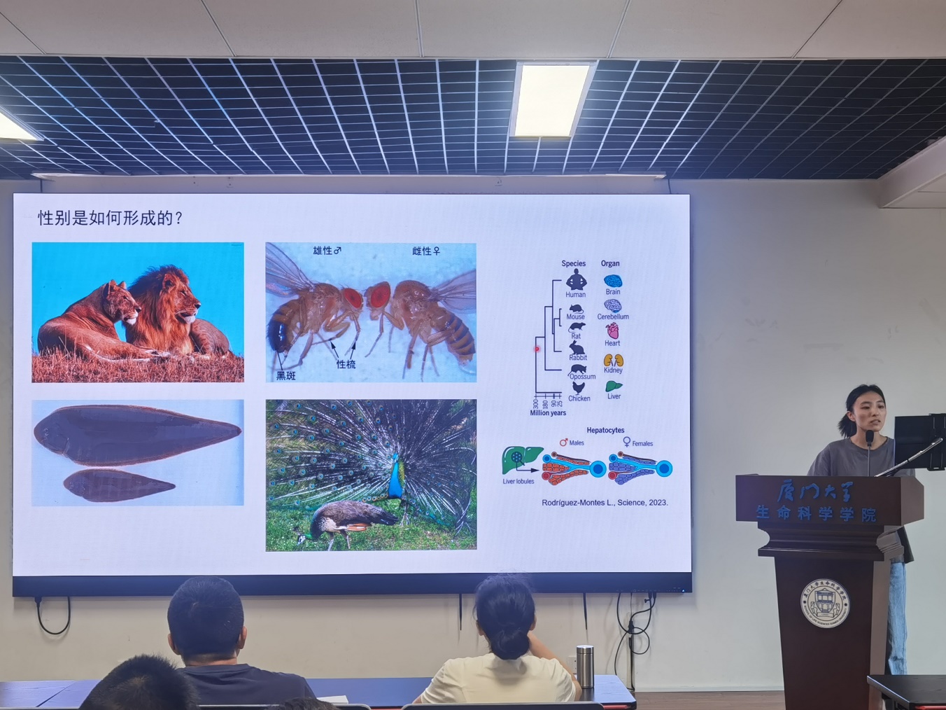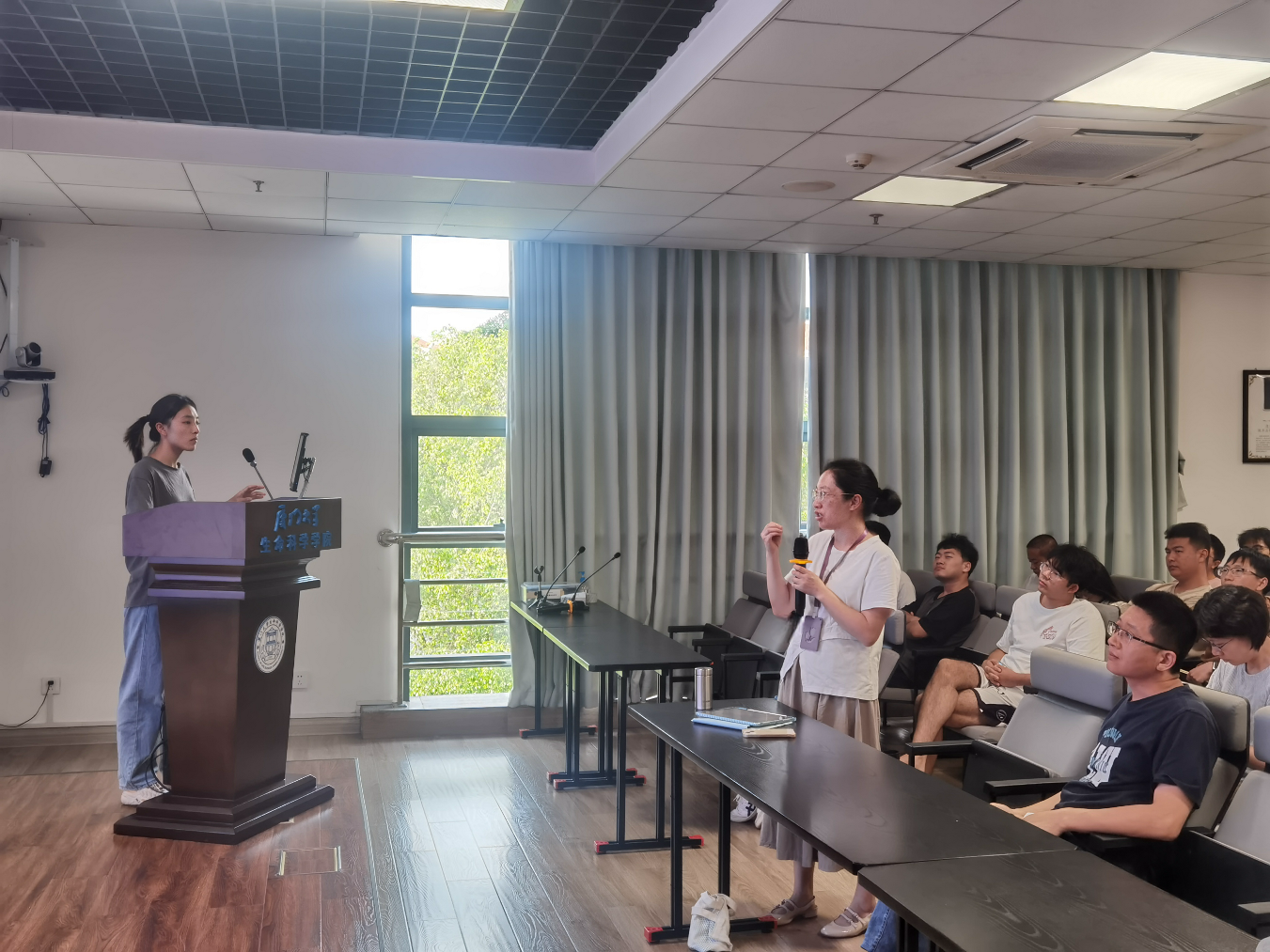 李欢同学以《脊椎动物祖先——头索动物文昌鱼性别分化调控机制研究》为题向师生们作“科研创新发展”部分的分享。她通过详实的实验图片和数据图表,汇报了自己关于文昌鱼研究的最新科研进展,并表示该研究结果揭示了文昌鱼种间存在性别决定机制的转化,为阐释脊椎动物性别GRN的起源提供了依据。与会的生物学系党支部成员肯定了李欢同学的研究工作,并对其进行了有针对性的下一步指导。