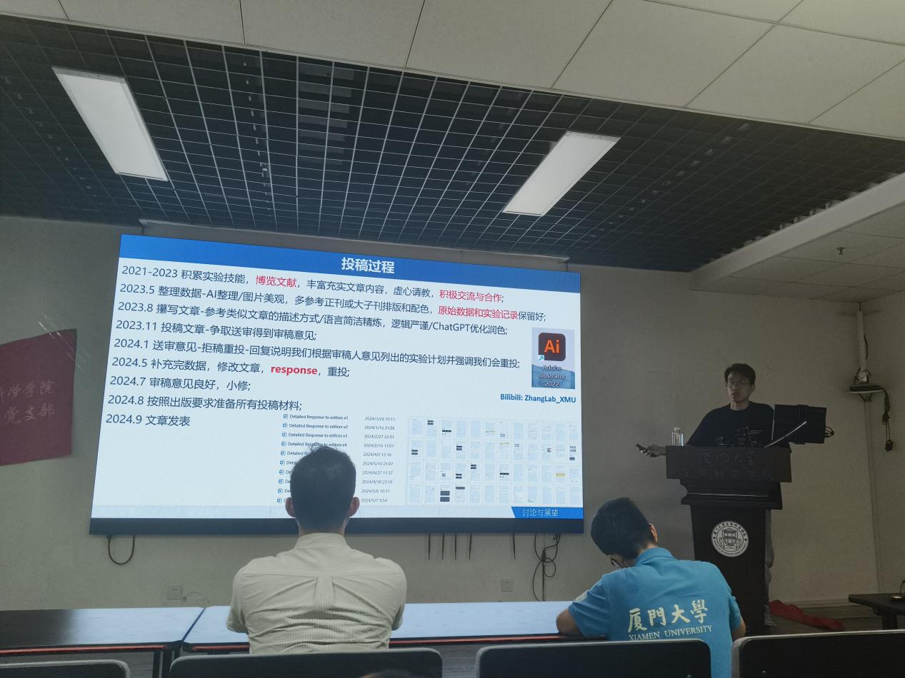 最后,郑华雷同学向大家分享了自己的投稿过程。他详细讲述了论文撰写的各个环节,包括选定合适的期刊、撰写摘要和引言、以及确保实验结果和讨论部分的逻辑性和连贯性。郑华雷同学还强调了与导师和同学进行充分讨论的重要性,以获得反馈并优化论文质量。在投稿过程中,他提到了一些实用的技巧,比如如何根据期刊的要求调整格式、准备附录材料,以及应对审稿人意见的策略。他分享了在收到审稿意见后,如何进行逐条回复,并根据反馈对论文进行修订的经验。通过这一分享,郑华雷同学不仅为大家提供了宝贵的投稿经验,也激励了在场的研究生们积极参与科研发表,提升自己的学术能力。