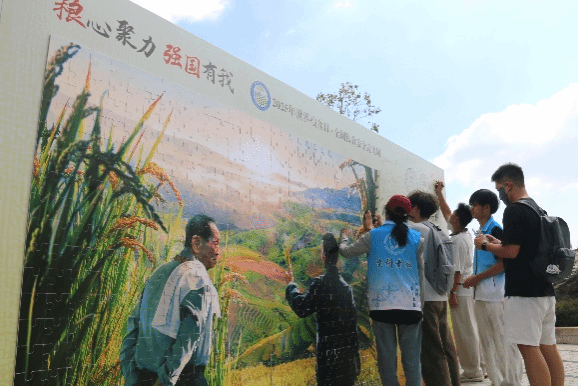 10月16日至18日,在翔安校区思源餐厅前广场,一幅名为《一梦70年》的画作,在一张张拼图的嵌入下逐渐显色,画面中,袁隆平院士立于丰收的稻田之间,与青年时期的自己对望。这是为致敬“杂交水稻之父”袁隆平院士、倡导节约粮食和“光盘行动”而设计的拼图互动环节。活动期间,师生每“光盘”一次,即可凭“光盘”照片兑换一块拼图亲手参与拼接,最终还原画作原貌。589块拼图块,背后是589次“光盘”,更是每一位师生以节约粮食的实际行动向袁老致敬、为“粮安”献礼。