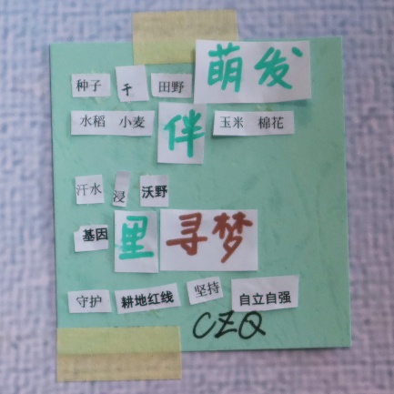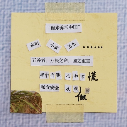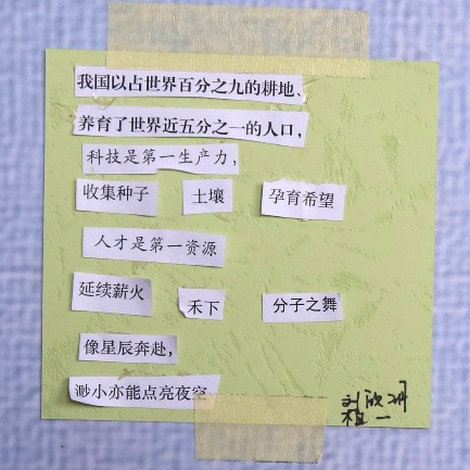 为深化政治理论学习成效,党支部还在理论学习之后开展了“耕耘诗行”拼贴诗创作环节。师生们从理论学习、科学家语录、科研实践等方面素材中汲取灵感,将“粮食安全”这一主题用情真意切的诗句表达出来。