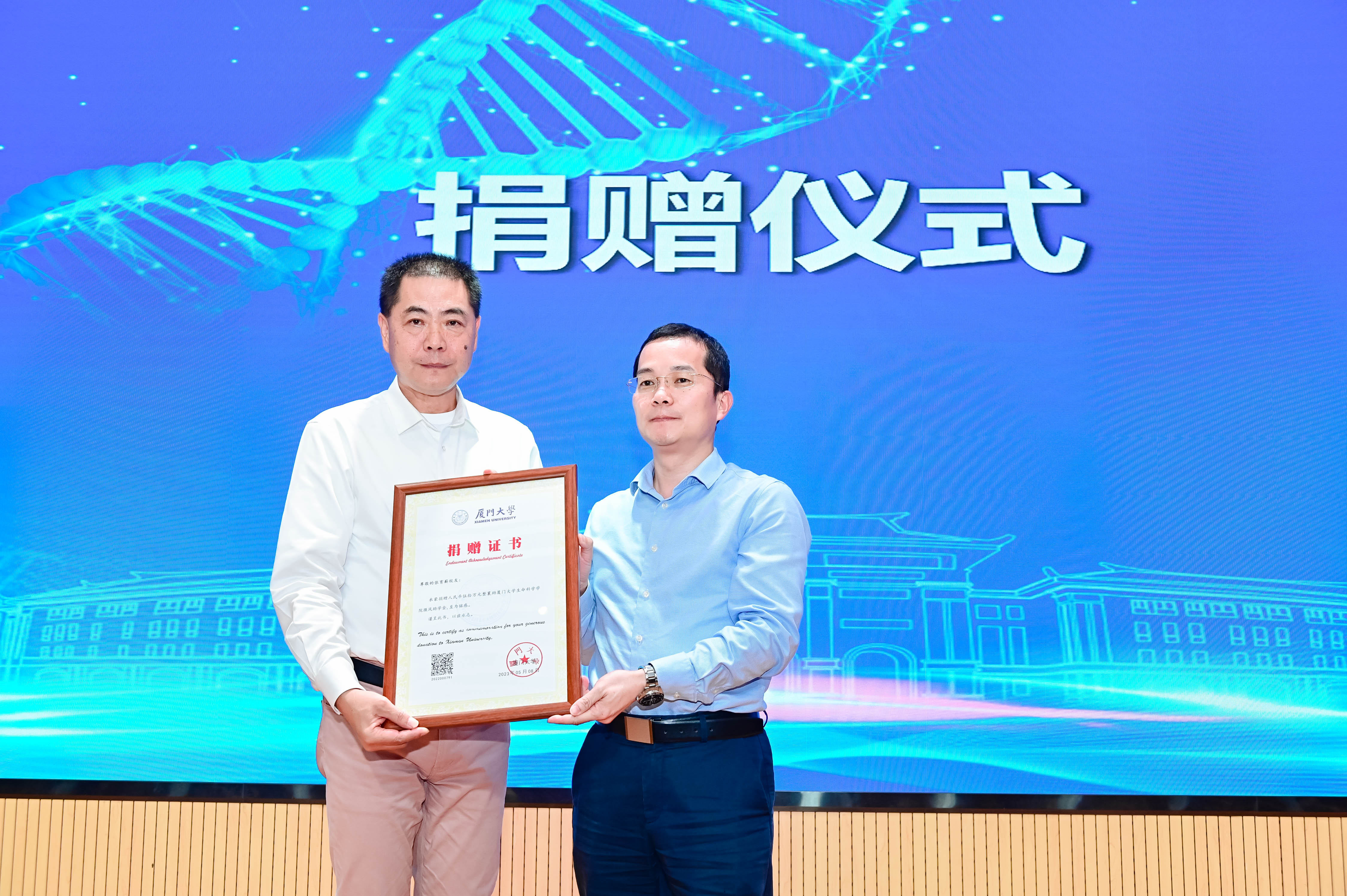 院长邓贤明为两位校友颁发“厦门大学生物学科杰出校友纪念牌”,为设立微风助学金的张育薪校友和设立蔡司奖学金的蔡司公司代表张宁女士授予捐赠证书。