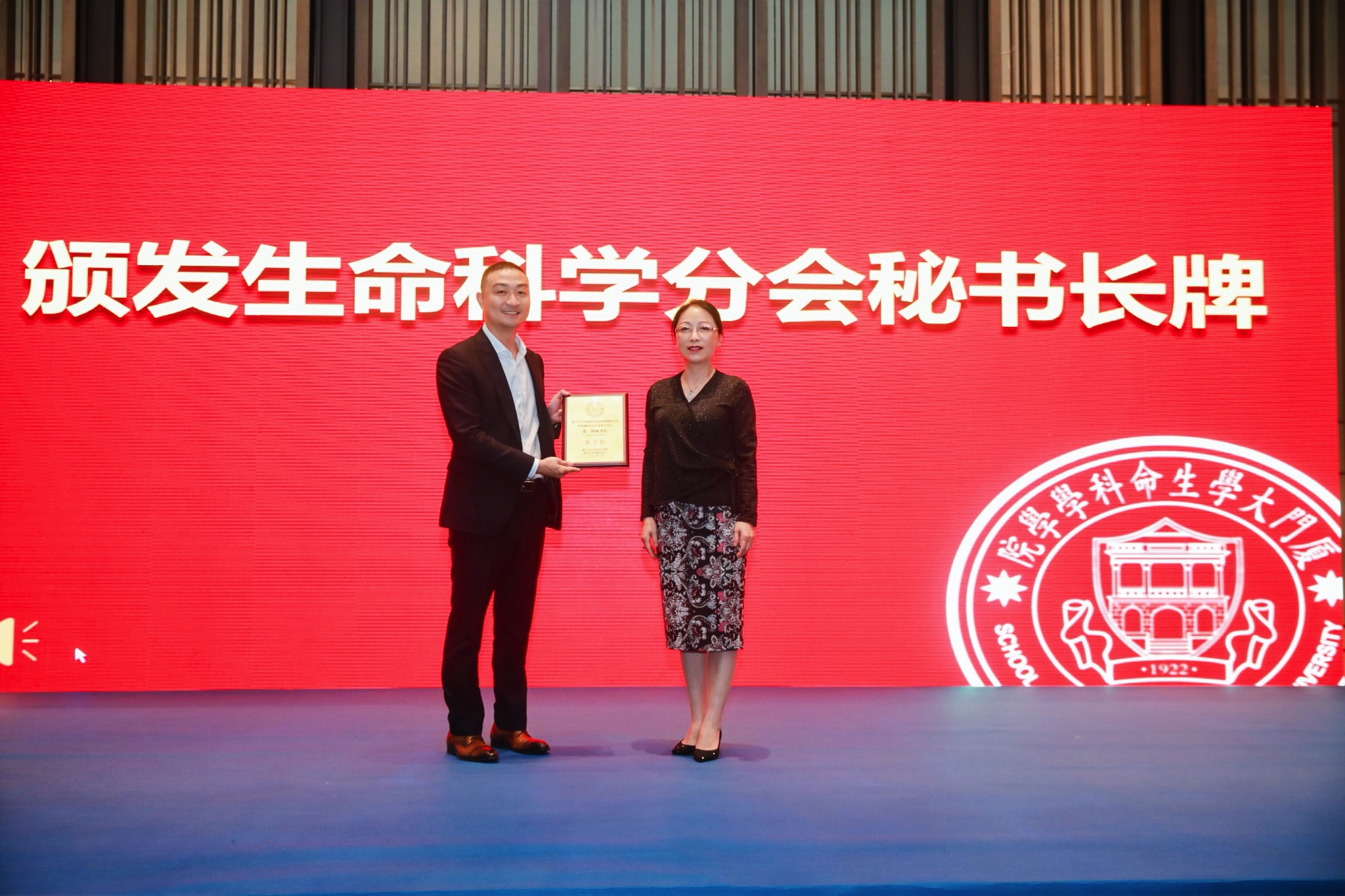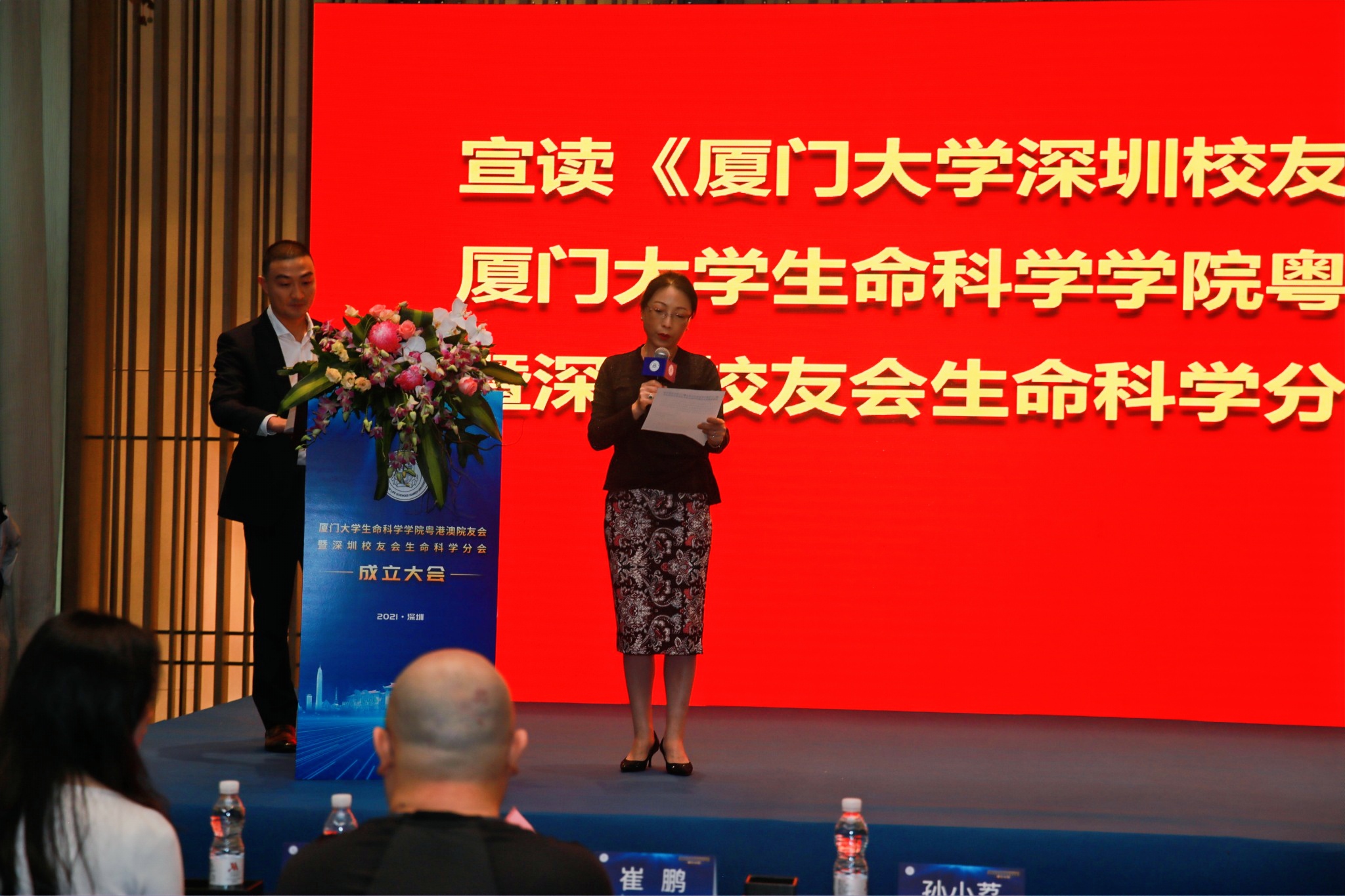 厦门大学深圳校友会理事长孙小荔女士宣读《厦门大学深圳校友会关于成立厦门大学生命科学学院粤港澳院友会暨深圳校友会生命科学分会的决定》,随后大会审议并一致通过了《厦门大学生命科学学院粤港澳院友会暨深圳校友会生命科学分会组织章程(草案)》,审议并选举了第一届理事会理事长、监事长、副理事长、秘书长等,由1996级院友崔鹏任首任理事长,1978级院友夏念和任首任监事长,1997级院友朱子恒任首任秘书长。