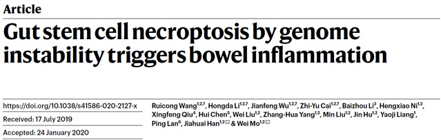 A research paper gut stem cell neurosis by genome reliability triggers bowel was published in Nature, the top influential scientific journals on Apr 19. This work was achieved under the supervision of Dr. Mo, Wei and Dr. Han, Jiahuai in State Key Laboratory of cell stress biology, School of life sciences, Xiamen University. They reported that the unstable genome activated zbp1-rip3-mlkl axis in intestinal stem cells which triggers necroptotic cell death and bowel inflammation.