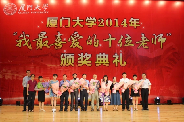 The presentation of “My Ten Favorite Teachers” awards was held in Xiamen University on October 22. Ten award-winners were elected by the students voting online. The ten teachers are from different schools of the university. They are Lin Jianhua, professor of School of Mathematical Sciences, Wang Beizhan, professor of School of Software, Zhou Changle, professor of School of Information Science and Technology, Sun Liying, professor of School of Management, Hu Hongmei, professor of School of Architecture and Civil Engineering, Lin Shengcai, professor of School of Life Sciences, Huang lingyi, professor of College of Foreign Languages and Cultures, Guo Ye, professor of School of Economics, Shi Yan, professor of College of Humanities, and Zheng Gaofeng, professor of School of Physics and Mechanical & Electrical Engineering.