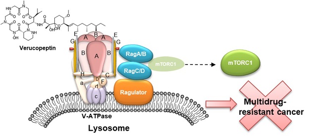 Summary: Multidrug resistance (MDR) in cancer remains a major challenge for the success of chemotherapy. Natural products have been a rich source for the discovery of drugs against MDR cancers. Here, we applied high-throughput cytotoxicity screening of an in-house natural product library against MDR SGC7901/VCR cells and identified that the cyclodepsipeptide verucopeptin demonstrated notable antitumor potency. Cytological profiling combined with click chemistry-based proteomics revealed that ATP6V1G directly interacted with verucopeptin. ATP6V1G, a subunit of the vacuolar H+-ATPase (v-ATPase) that has not been previously targeted, was essential for SGC7901/VCR cell growth. Verucopeptin exhibited strong inhibition of both v-ATPase activity and mTORC1 signaling, leading to substantial pharmacological efficacy against SGC7901/VCR cell proliferation and tumor growth in vivo. Our results demonstrate that targeting v-ATPase via its V1G subunit constitutes a unique approach for modulating v-ATPase and mTORC1 signaling with great potential for the development of therapeutics against MDR cancers.