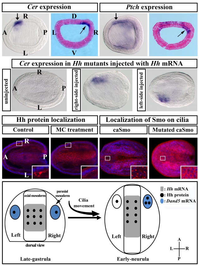 Abstract:Cilia rotation-driven nodal flow is crucial for the left-right (L-R) break in symmetry in most vertebrates. However, the mechanism by which the flow signal is translated to asymmetric gene expression has been insufficiently addressed. Here, we show that Hedgehog (Hh) signalling is asymmetrically activated (LLink: https://dev.biologists.org/content/147/1/dev182469.long