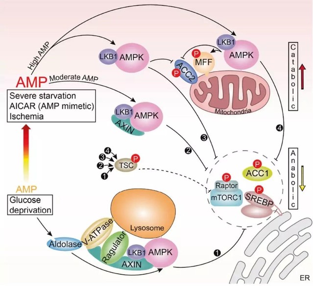 Abstract:AMPK, a master regulator of metabolic homeostasis, is activated by both AMP-dependent and AMP-independent mechanisms. The conditions under which these different mechanisms operate, and their biological implications are unclear. Here, we show that, depending on the degree of elevation of cellular AMP, distinct compartmentalized pools of AMPK are activated, phosphorylating different sets of targets. Low glucose activates AMPK exclusively through the AMP-independent, AXIN-based pathway in lysosomes to phosphorylate targets such as ACC1 and SREBP1c, exerting early anti-anabolic and pro-catabolic roles. Moderate increases in AMP expand this to activate cytosolic AMPK also in an AXIN-dependent manner. In contrast, high concentrations of AMP, arising from severe nutrient stress, activate all pools of AMPK independently of AXIN. Surprisingly, mitochondrion-localized AMPK is activated to phosphorylate ACC2 and mitochondrial fission factor (MFF) only during severe nutrient stress. Our findings reveal a spatiotemporal basis for hierarchical activation of different pools of AMPK during differing degrees of stress severity.
