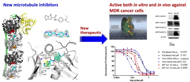 Abstract: Microtubule inhibitors as chemotherapeutic drugs are widely used for cancer treatment. However, the development of multidrug resistance (MDR) in cancer is a major challenge for microtubule inhibitors in their clinical implementation. From a high-throughput drug screen using cells transformed by oncogenic RAS, we identify a lead heteroaryl amide compound that blocks cell proliferation. Analysis of the structure-activity relationship indicated that this series of scaffolds (exemplified by MP-HJ-1b) represents a potent inhibitor of tumor cell growth. MP-HJ-1b showed activities against a panel of more than 1,000 human cancer cell lines with a wide variety of tissue origins. This compound depolymerized microtubules and affected spindle formation. It also induced the spike-like conformation of microtubules in vitro and in vivo, which is different from typical microtubule modulators. Structural analysis revealed that this series of compounds bound the colchicine pocket at the intra-dimer interface, although mostly not overlapping with colchicine binding. MP-HJ-1b displayed favorable pharmacological properties for overcoming tumor MDR, both in vitro and in vivo. Taken together, our data reveal a novel scaffold represented by MP-HJ-1b that can be developed as a cancer therapeutic against tumors with MDR.