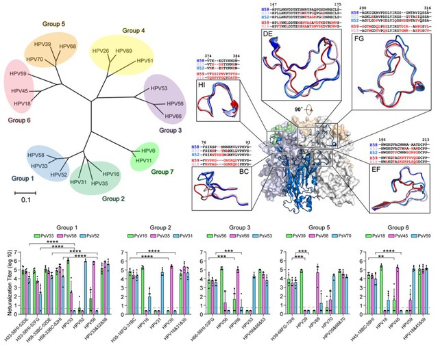 Abstract: Sequence variability in surface-antigenic sites of pathogenic proteins is an important obstacle in vaccine development. Over 200 distinct genomic sequences have been identified for human papillomavirus (HPV), of which more than 18 are associated with cervical cancer. Here, based on the high structural similarity of L1 surface loops within a group of phylogenetically close HPV types, we design a triple-type chimera of HPV33/58/52 using loop swapping. The chimeric VLPs elicit neutralization titers comparable with a mix of the three wild-type VLPs both in mice and non-human primates. This engineered region of the chimeric protein recapitulates the conformational contours of the antigenic surfaces of the parental-type proteins, offering a basis for this high immunity. Our stratagem is equally successful in developing other triplet-type chimeras (HPV16/35/31, HPV56/66/53, HPV39/68/70, HPV18/45/59), paving the way for the development of an improved HPV prophylactic vaccine against all carcinogenic HPV strains. This technique may also be extrapolated to other microbes.