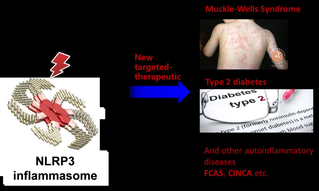 Abstract: The NLRP3 inflammasome has been implicated in the pathogenesis of a wide variety of human diseases. A few compounds have been developed to inhibit NLRP3 inflammasome activation, but compounds directly and specifically targeting NLRP3 are still not available, so it is unclear whether NLRP3 itself can be targeted to prevent or treat diseases. Here we show that the compound CY-09 specifically blocks NLRP3 inflammasome activation. CY-09 directly binds to the ATP-binding motif of NLRP3 NACHT domain and inhibits NLRP3 ATPase activity, resulting in the suppression of NLRP3 inflammasome assembly and activation. Importantly, treatment with CY-09 shows remarkable therapeutic effects on mouse models of cryopyrin-associated autoinflammatory syndrome (CAPS) and type 2 diabetes. Furthermore, CY-09 is active ex vivo for monocytes from healthy individuals or synovial fluid cells from patients with gout. Thus, our results provide a selective and direct small-molecule inhibitor for NLRP3 and indicate that NLRP3 can be targeted in vivo to combat NLRP3-driven diseases.