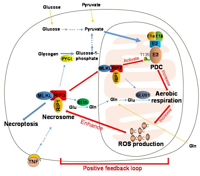 Abstract: Receptor-interacting protein kinase 3 (RIP3)-regulated production of reactive oxygen species (ROS) positively feeds back on tumour necrosis factor (TNF)-induced necroptosis, a type of programmed necrosis. Glutamine catabolism is known to contribute to RIP3-mediated ROS induction, but the major contributor is unknown. Here, we show that RIP3 activates the pyruvate dehydrogenase complex (PDC, also known as PDH), the rate-limiting enzyme linking glycolysis to aerobic respiration, by directly phosphorylating the PDC E3 subunit (PDC-E3) on T135. Upon activation, PDC enhances aerobic respiration and subsequent mitochondrial ROS production. Unexpectedly, mixed-lineage kinase domain-like (MLKL) is also required for the induction of aerobic respiration, and we further show that it is required for RIP3 translocation to meet mitochondria-localized PDC. Our data uncover a regulation mechanism of PDC activity, show that PDC activation by RIP3 is most likely the major mechanism activated by TNF to increase aerobic respiration and its by-product ROS, and suggest that RIP3-dependent induction of aerobic respiration contributes to pathologies related to oxidative stress.