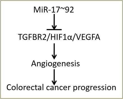 Abstract: The miR-17~92 microRNA (miRNA) cluster host gene is upregulated in a broad spectrum of human cancers including colorectal cancer (CRC). Previous studies have shown that miR-17~92 promotes tumorigenesis and cancer angiogenesis in some tumor models. However, its role in the initiation and progression of CRC remains unknown. In this study, we found that transgenic mice overexpressing miR-17~92 specifically in epithelial cells of the small and large intestines exhibited decreased tumor size and tumor angiogenesis in azoxymethane and dextran sulfate sodium salt (AOM-DSS)-induced CRC model as compared to their littermates control. Further study showed that miR-17~92 inhibited the progression of CRC via suppressing tumor angiogenesis through targeting multiple tumor angiogenesis-inducing genes, TGFBR2, HIF1α, and VEGFA in vivo and in vitro. Collectively, we demonstrated that miR-17~92 suppressed tumor progression by inhibiting tumor angiogenesis in a genetically engineered mouse model, indicating the presence of cellular context-dependent pro- and anti-cancer effects of miR-17~92.