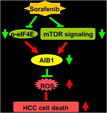 Abstract: Multi-kinase inhibitor sorafenib represents a major breakthrough in the therapy of advanced hepatocellular carcinoma (HCC). Amplified in breast cancer 1 (AIB1) is frequently overexpressed in human HCC tissues and promotes HCC progression. In this study, we investigated the effects of sorafenib on AIB1 expression and the role of AIB1 in anti-tumor effects of sorafenib. We found that sorafenib downregulated AIB1 protein expression by inhibiting AIB1 mRNA translation through simultaneously blocking eIF4E and mTOR/p70S6K/RP-S6 signaling. Knockdown of AIB1 significantly promoted sorafenib-induced cell death, whereas overexpression of AIB1 substantially diminished sorafenib-induced cell death. Downregulation of AIB1 contributed to sorafenib-induced cell death at least in part through upregulating the levels of reactive oxygen species in HCC cells. In addition, resistance to sorafenib-induced downregulation of AIB1 protein contributes to the acquired resistance of HCC cells to sorafenib-induced cell death. Collectively, our study implicates that AIB1 is a molecular target of sorafenib and downregulation of AIB1 contributes to the anti-tumor effects of sorafenib.