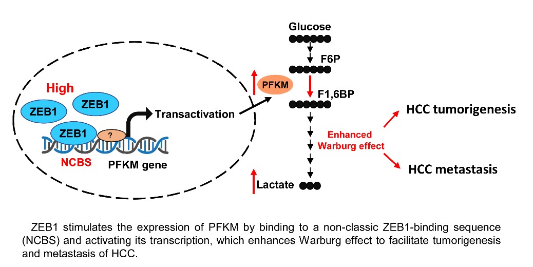 Results:We found that ZEB1 transcriptionally upregulates the expression of the muscle isoform of phosphofructokinase-1 (PFKM), a rate-limiting enzyme in glycolysis. Intriguingly, a non-classic ZEB1-binding sequence in the promoter region of PFKM was identified through which ZEB1 directly activates the transcription of PFKM. Silencing of ZEB1 in MHCC-97H and HCC-LM3 cell leads to impaired PFKM expression, glycolysis, proliferation and invasion, and such impairments are rescued by exogenous expression of PFKM. Importantly,in-situHCC xenograft assays and studies from TCGA database demonstrate that ZEB1-PFKM axis is crucial for carcinogenesis and metastasis of HCC.