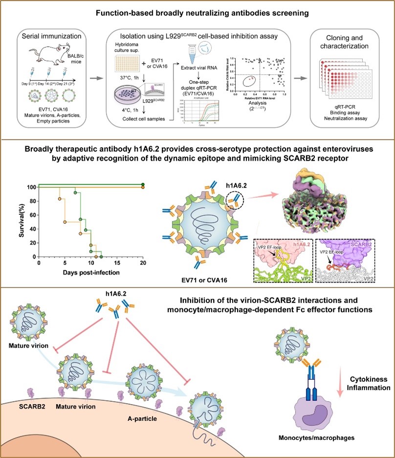 Abstract: Enteroviruses contain multiple serotypes and can cause severe neurological complications. The intricate life cycle of enteroviruses involving dynamic virus–receptor interaction hampers the development of broad therapeutics and vaccines. Here, using function-based screening, we identify a broadly therapeutic antibody h1A6.2 that potently protects mice in lethal models of infection with both enterovirus A71 and coxsackievirus A16 through multiple mechanisms, including inhibition of the virion–SCARB2 interactions and monocyte/macrophage-dependent Fc effector functions. h1A6.2 mitigates inflammation and improves intramuscular mechanics, which are associated with diminished innate immune signalling and preserved tissue repair. Moreover, cryogenic electron microscopy structures delineate an adaptive binding of h1A6.2 to the flexible and dynamic nature of the VP2 EF loop with a binding angle mimicking the SCARB2 receptor. The coordinated binding mode results in efficient binding of h1A6.2 to all viral particle types and facilitates broad neutralization of enterovirus, therefore informing a promising target for the structure-guided design of pan-enterovirus vaccine.