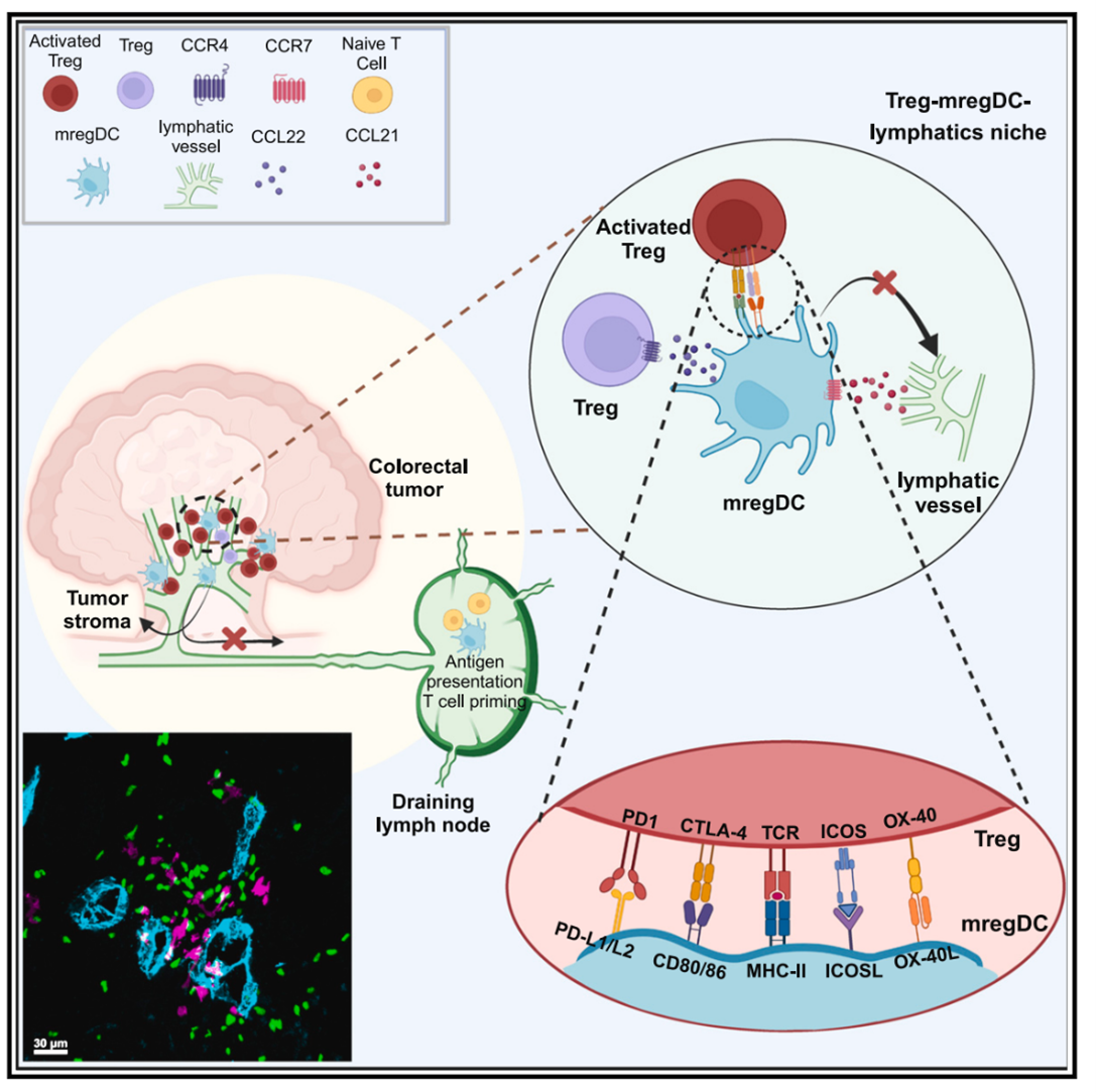 Summary: The tumor microenvironment (TME) has a significant impact on tumor growth and immunotherapy efficacies. However, the precise cellular interactions and spatial organizations within the TME that drive these effects remain elusive. Using advanced multiplex imaging techniques, we have discovered that regulatory T cells (Tregs) accumulate around lymphatic vessels in the peripheral tumor stroma. This localized accumulation is facilitated by mature dendritic cells enriched in immunoregulatory molecules (mregDCs), which promote chemotaxis of Tregs, establishing a peri-lymphatic Treg-mregDC niche. Within this niche, mregDCs facilitate Treg activation, which in turn restrains the trafficking of tumor antigens to the draining mesenteric lymph nodes, thereby impeding the initiation of anti-tumor adaptive immune responses. Disrupting Treg recruitment to mregDCs inhibits tumor progression. Our study provides valuable insights into the organization of TME and how local crosstalk between lymphoid and myeloid cells suppresses anti-tumor immune responses.